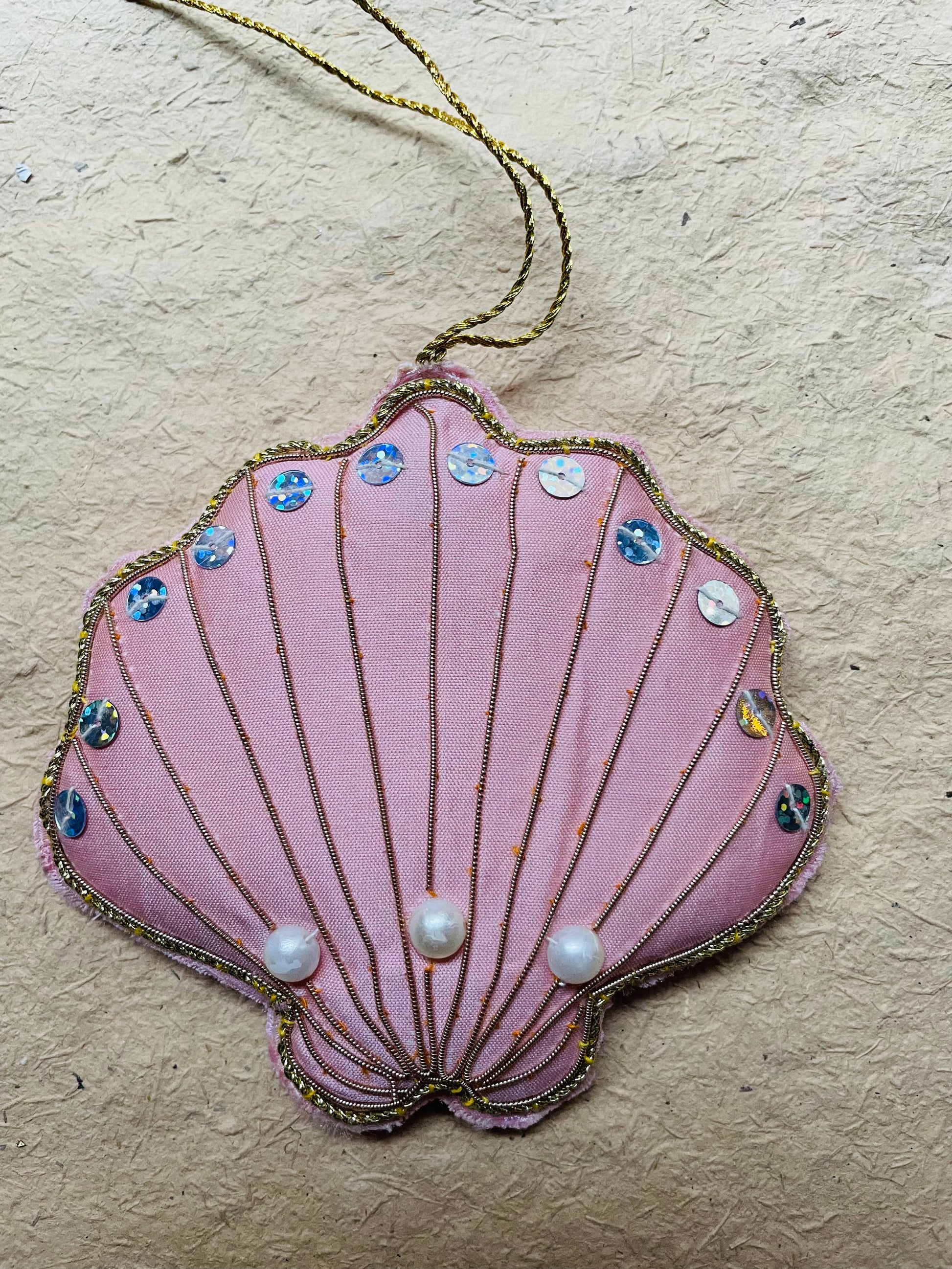 Delicate and dreamy, this Pink Tinsel Scallop Shell Ornament brings coastal elegance to your Christmas tree. Handcrafted in soft kantha fabric, the scallop shell shimmers with golden trim, pearly beads, and sequined accents that catch the light beautifully. At once nautical and refined, it’s a whimsical treasure for holiday decorating and a perfect complement to seaside-inspired celebrations.