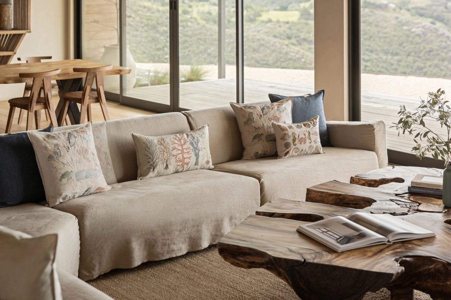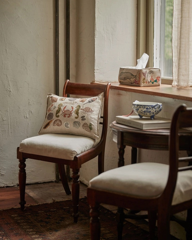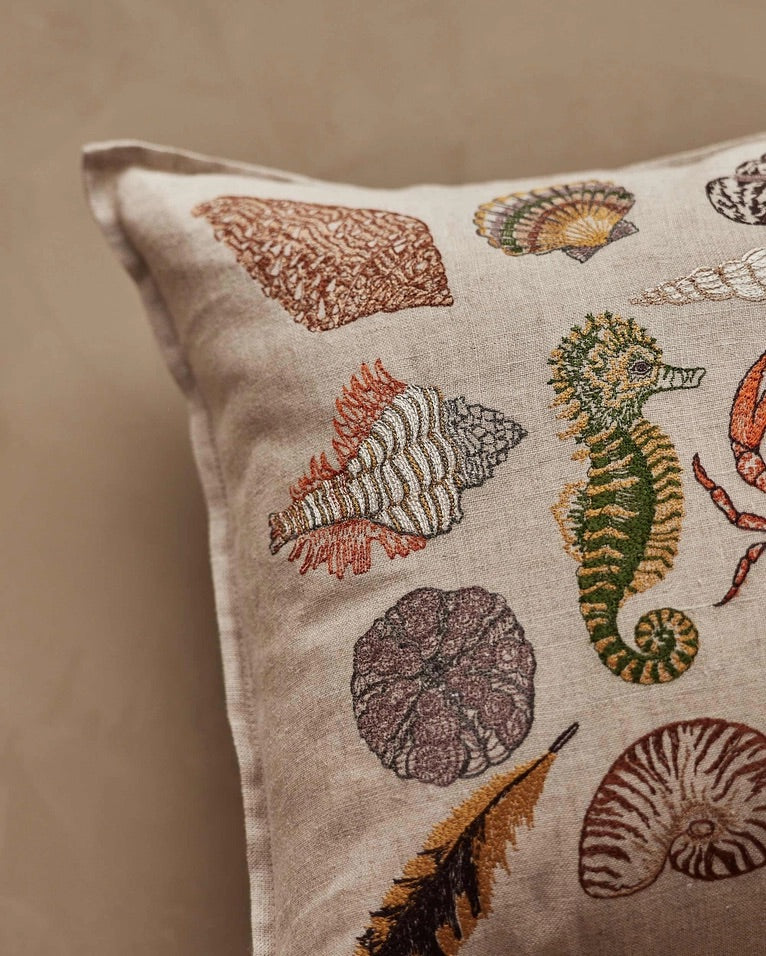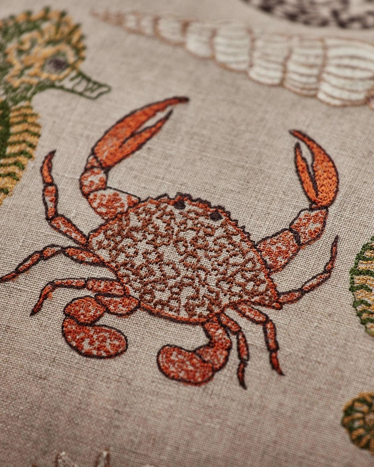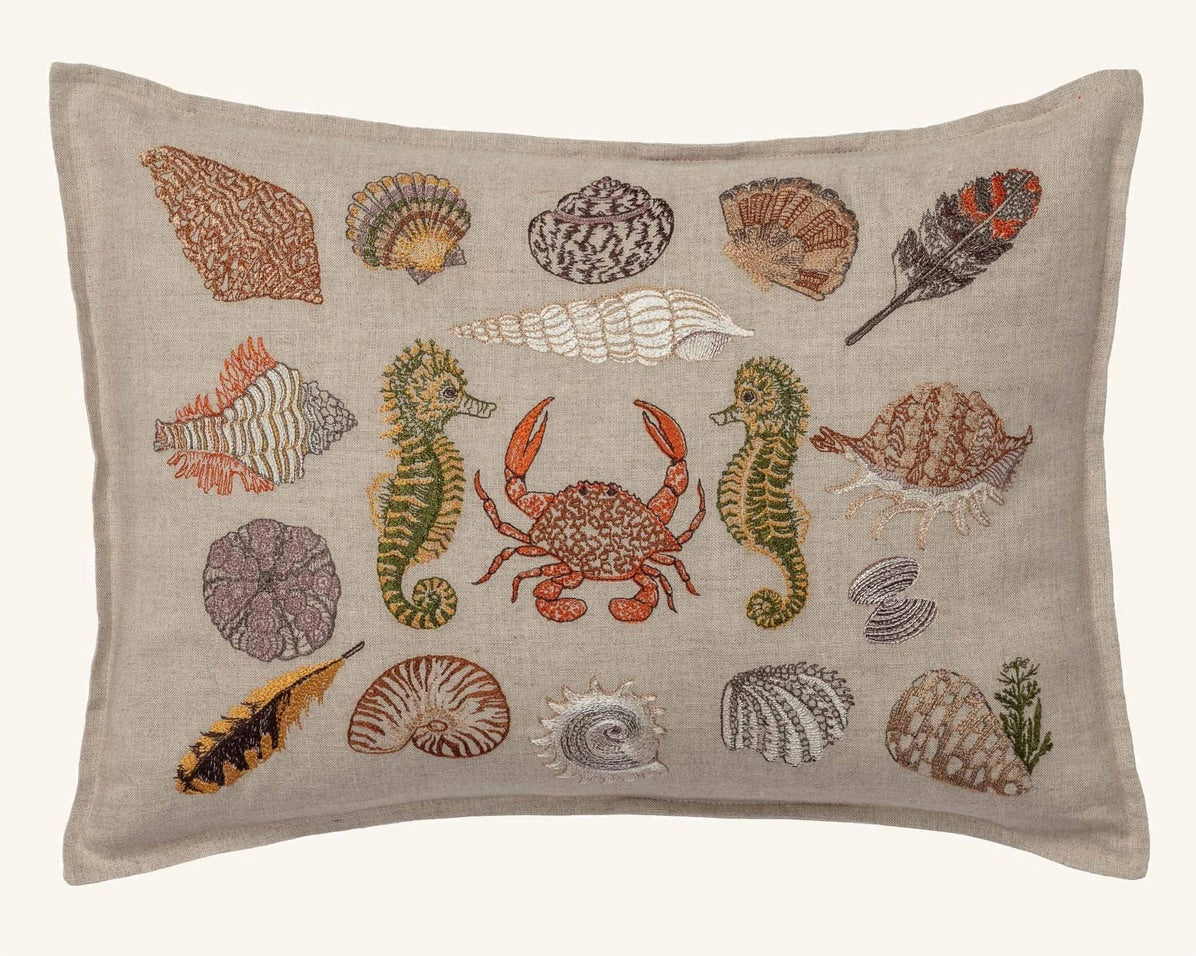 Walk along the surf to discover seaside souvenirs. Our embroidered beachcomber collection includes a variety of treasures that rolled in with the tide including shells, found feathers, a hermit crabÕs home, seahorses, an urchin and a red rock crab.