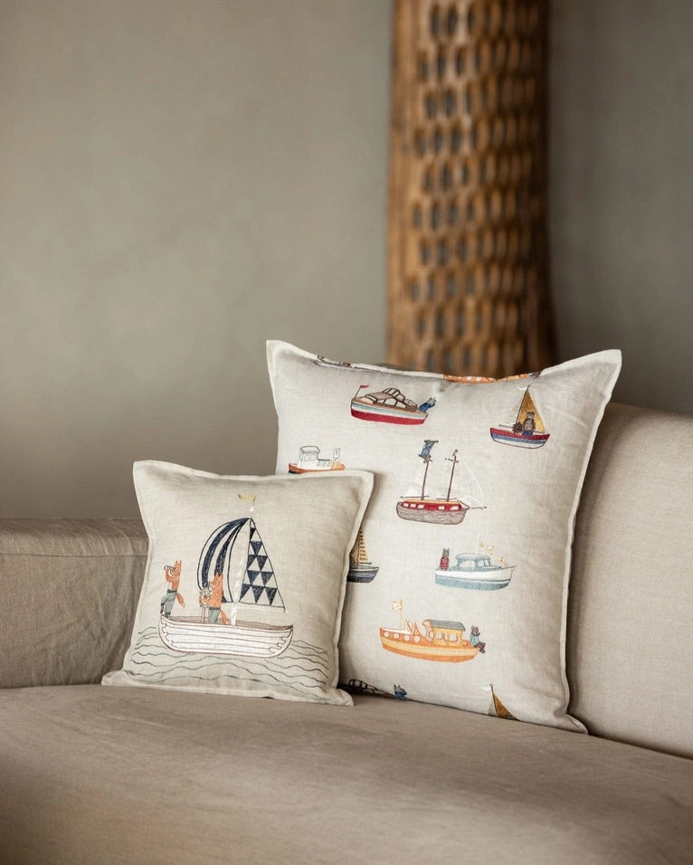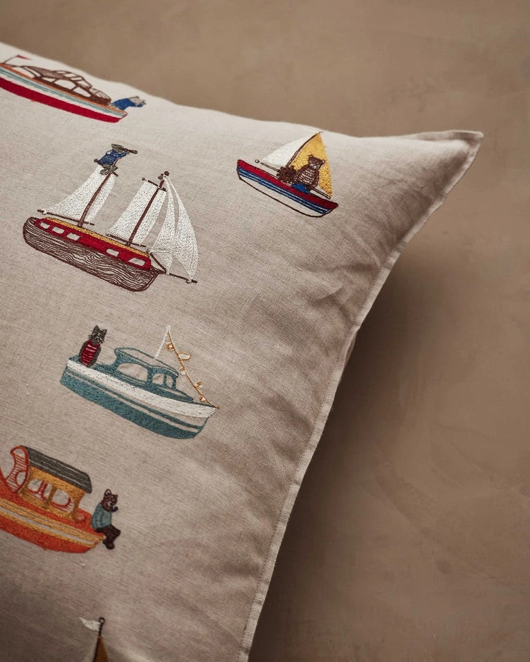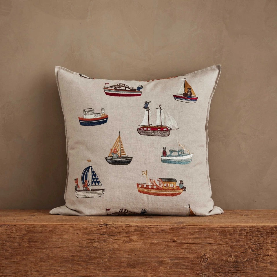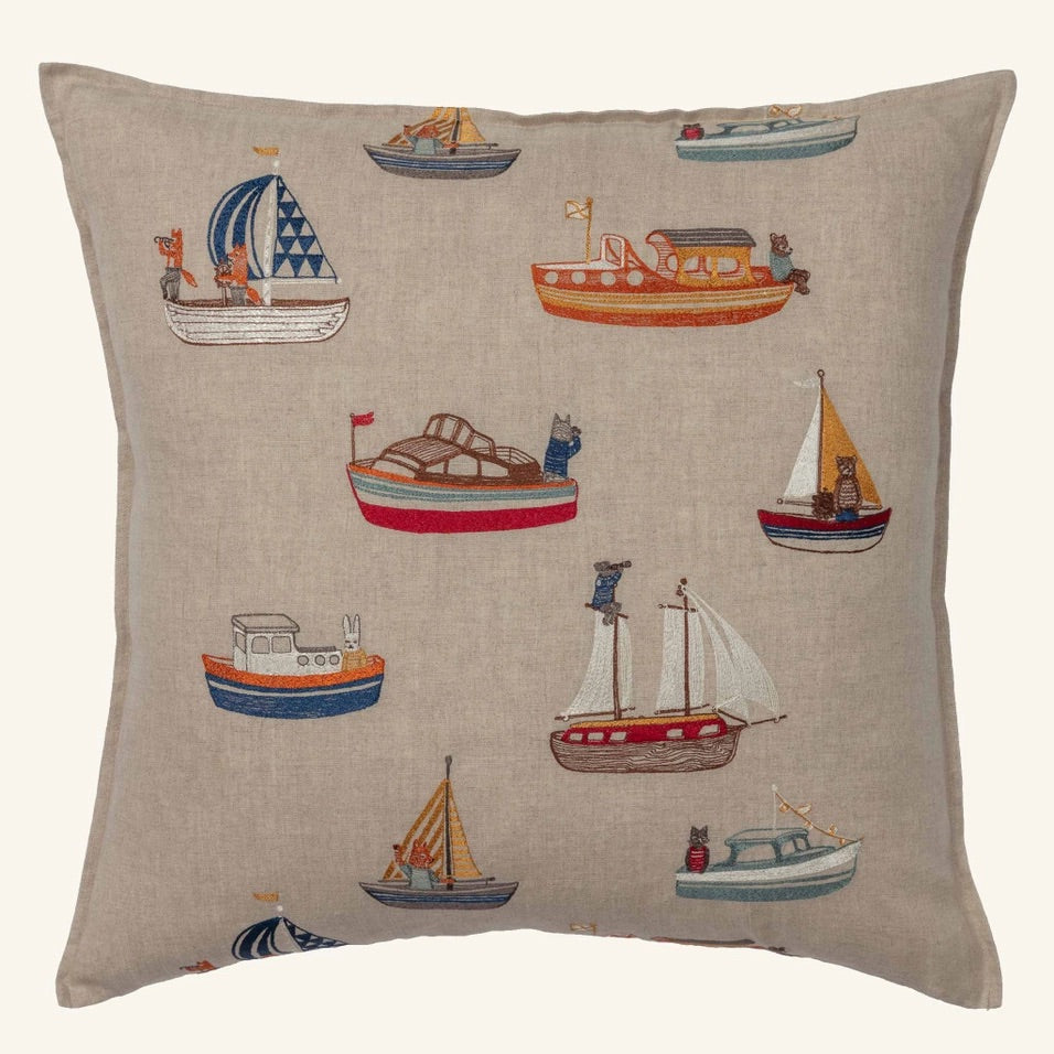 A fleet of fun boats deck out this pillow. Watch as bear takes the helm of a little yellow sloop, doggy paddles out on a majestic schooner, bunny steers the tug, tomcat hangs loose on a blue cruiser, kitty relaxes aboard a yacht and fox sails away. Go overboard with your decor, add our boats pillow to your sofa, accent chair or captainÕs cabin.