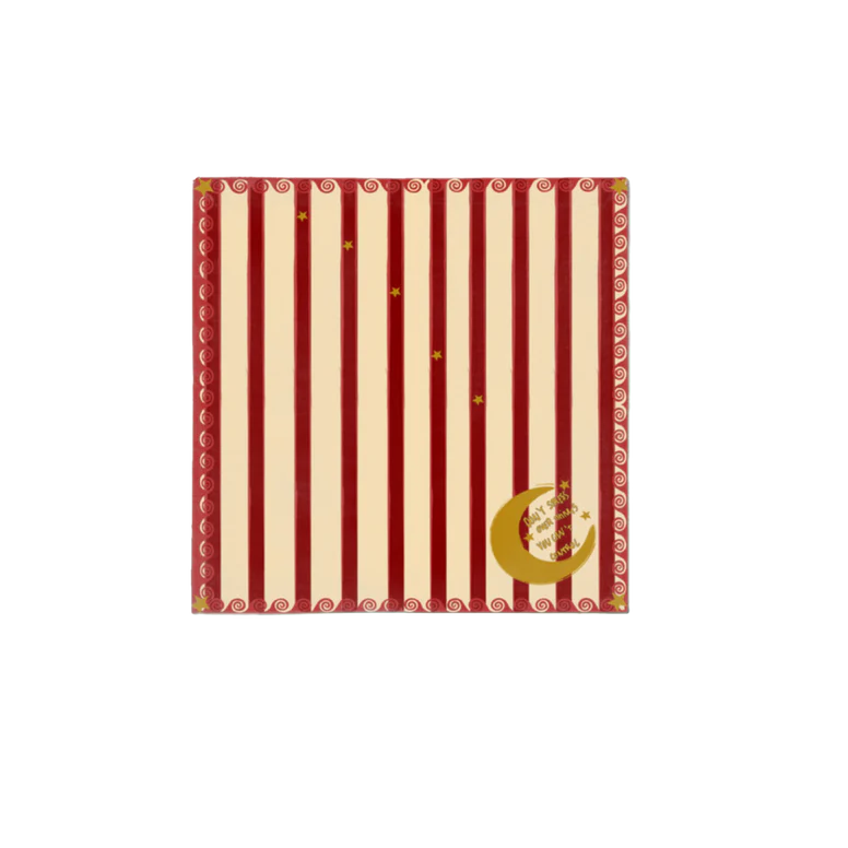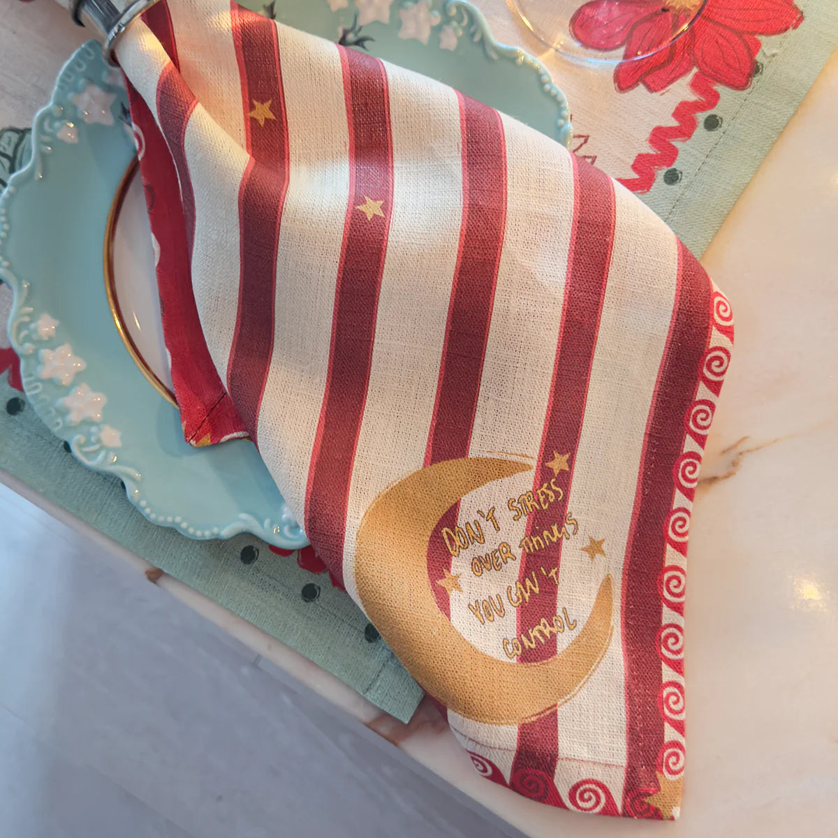 Elevate your hosting game with this playful yet refined striped napkin. Featuring warm red and beige hues and a whimsical quote, "Don't stress over things you can't control," on the right corner, this napkin is as versatile as it is chic. Perfect for any table setting, it adds a pop of color and a touch of lighthearted elegance.