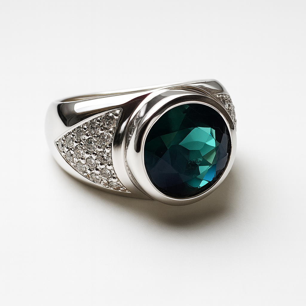 Centering a rare and magnificent deep green-blue tourmaline measuring 10 mm and weighing approximately 3.95 carats, set in a refined bezel frame with a mirror-cut finish.