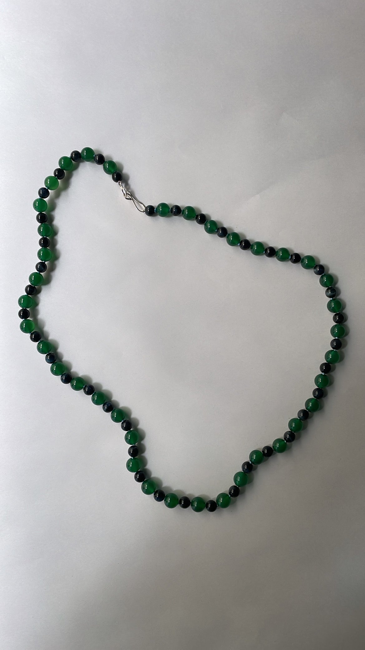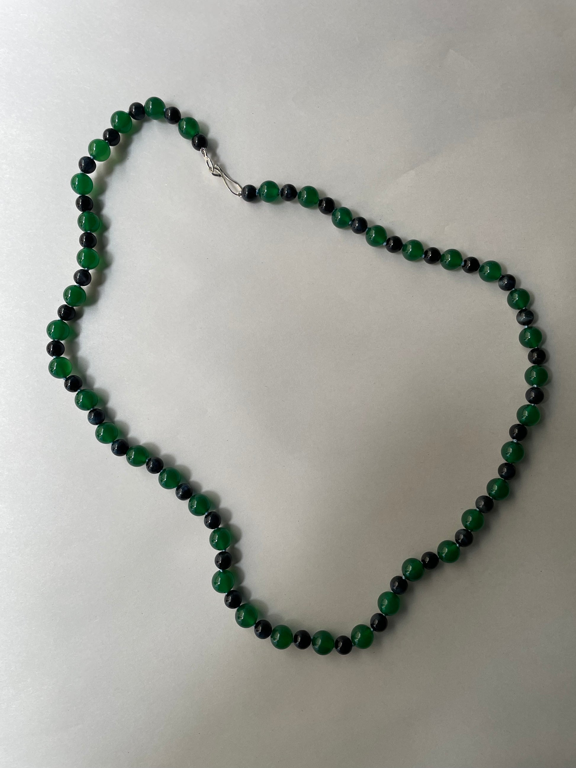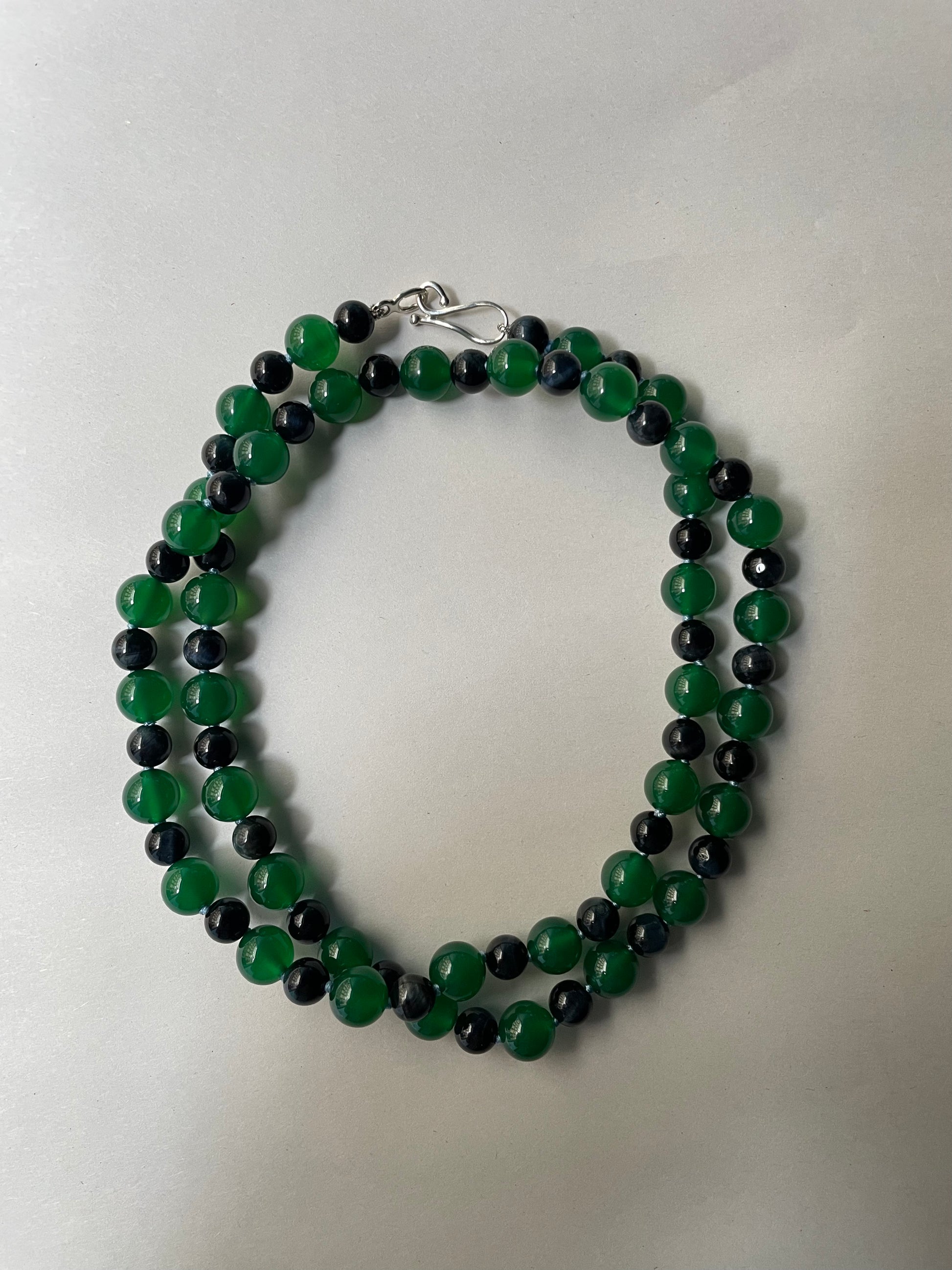Subtle and sculptural, this one-of-a-kind necklace features 8 mm and 10 mm beads of Eagle’s Eye and Dark Green Agate—stones known for their depth and quiet strength. The moody palette of forest green and stormy grey-blue is softened by a pale blue silk thread, giving the piece a poetic balance of weight and air. A handmade clasp and lock in 925 Sterling Silver completes the design.