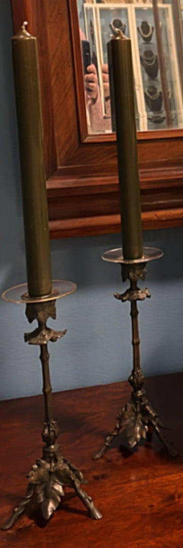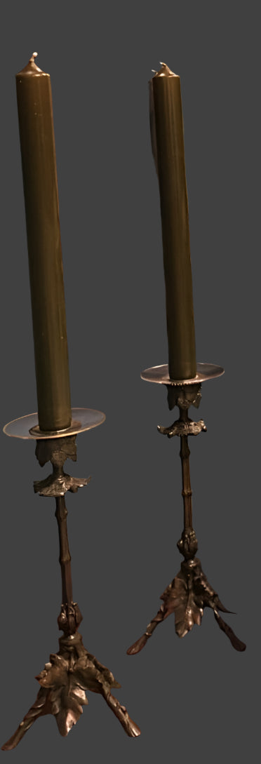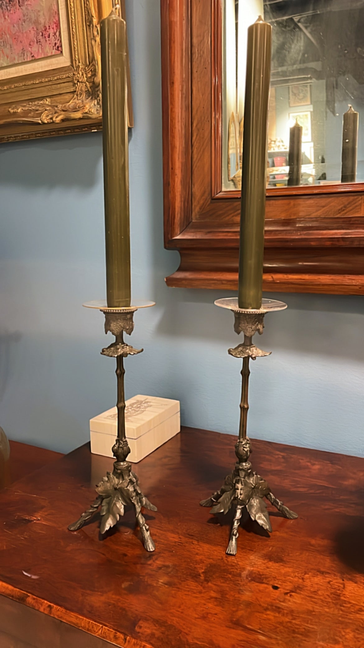 Elevate your space with these exquisite, antique candlesticks by acclaimed French founder, Ferdinand Barbedienne. Crafted in the mid 1800's, each piece boasts intricate brass detailing with snail and fauna detail and a classic, timeless design that will add a touch of old-world sophistication and luxury to any room.