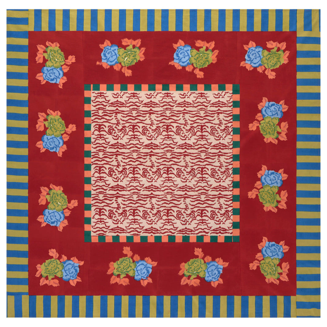 Indian Tiger Red features bold tiger motifs and Lisa Corti’s Big Flower design. Hand-printed in deep ruby, pink, and blue, this vibrant block print blends rich iconography with festive allure, creating a striking, maximalist statement.