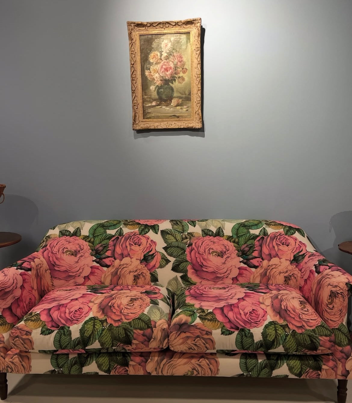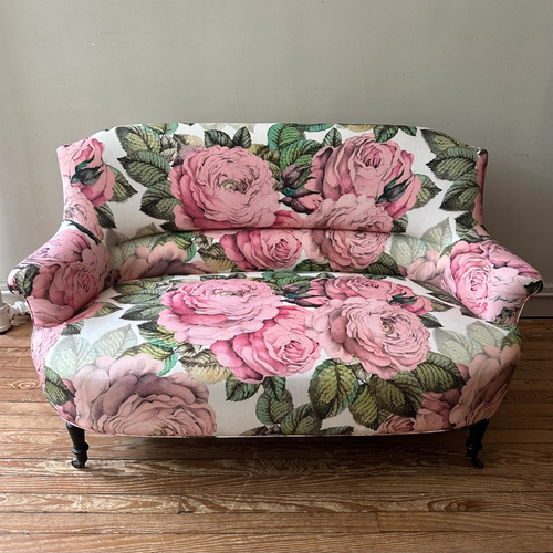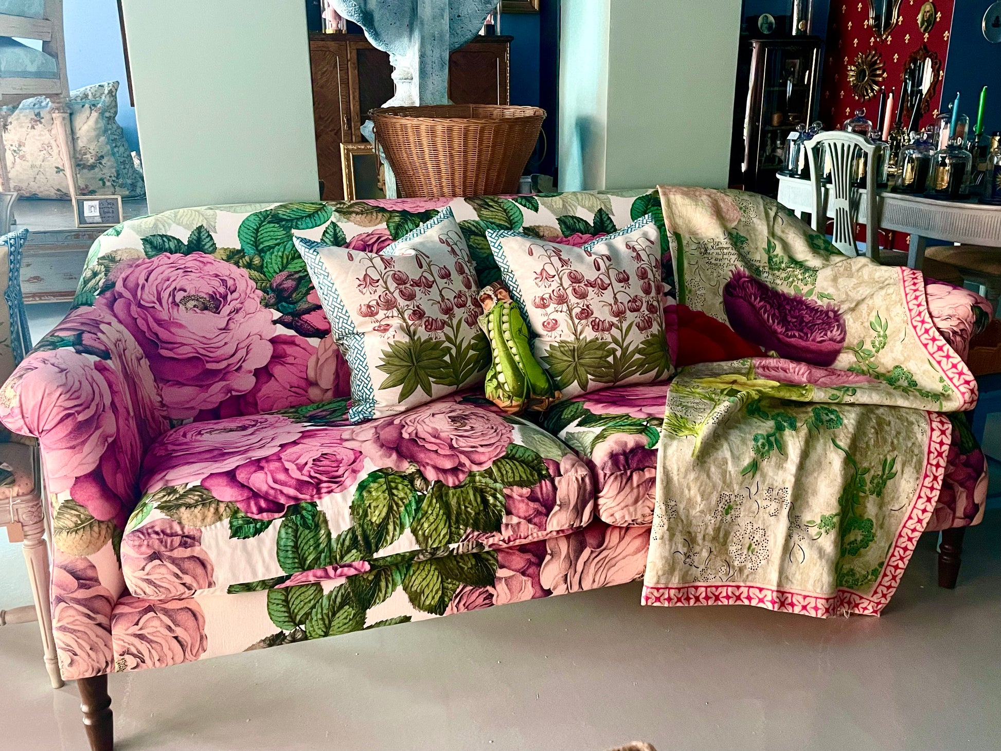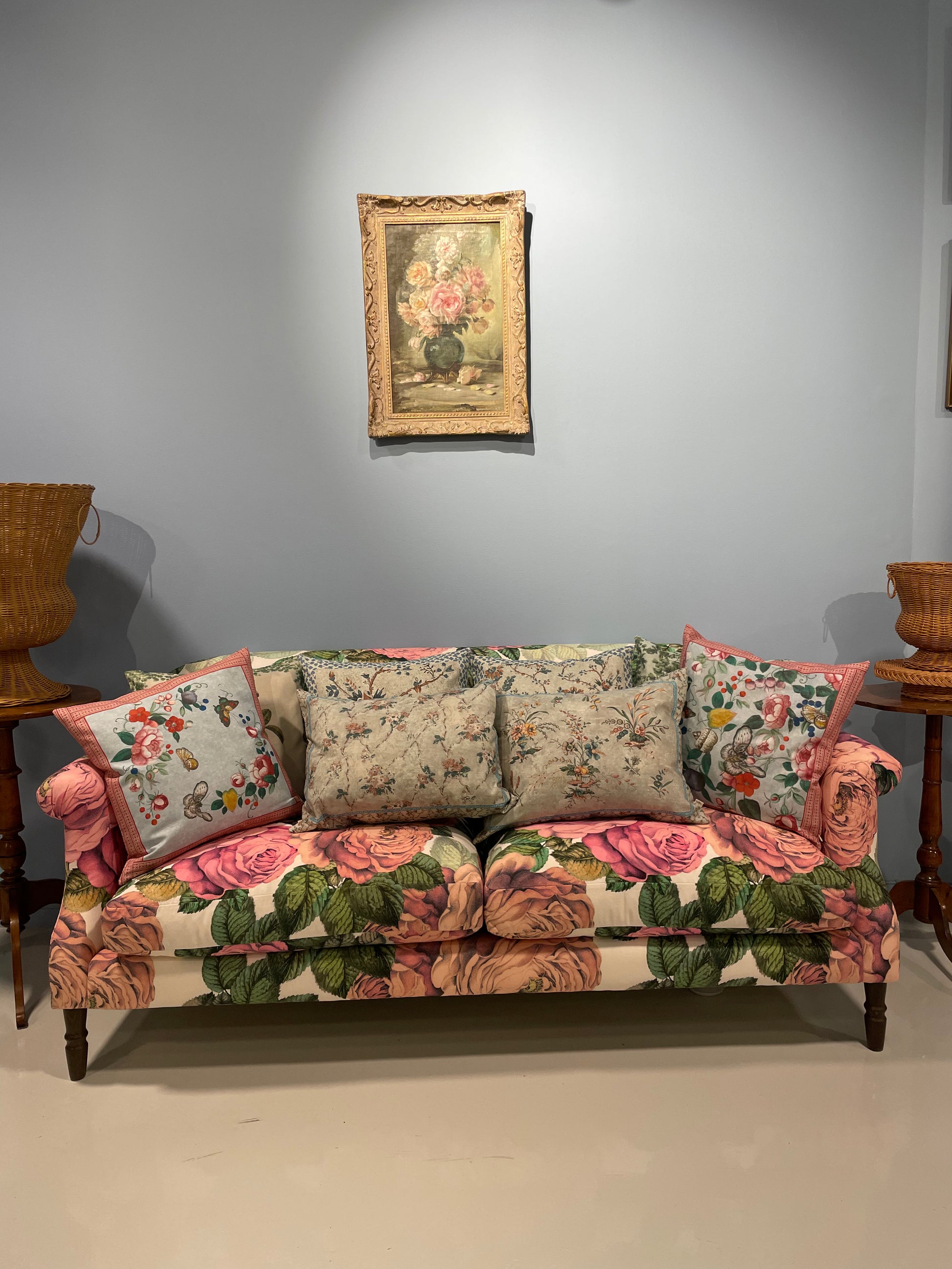 The 'Paris' Sofa, handcrafted in Italy with the luxurious Tuberose textile print from John Derian Company of New York City, exudes sophistication and exclusivity. Legs have a Walnut finish.
