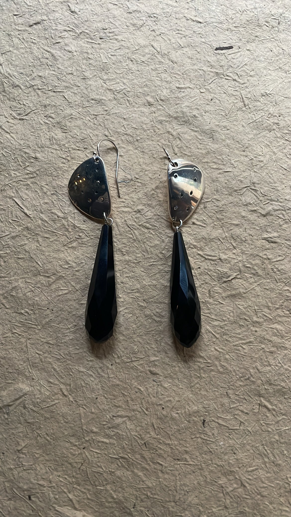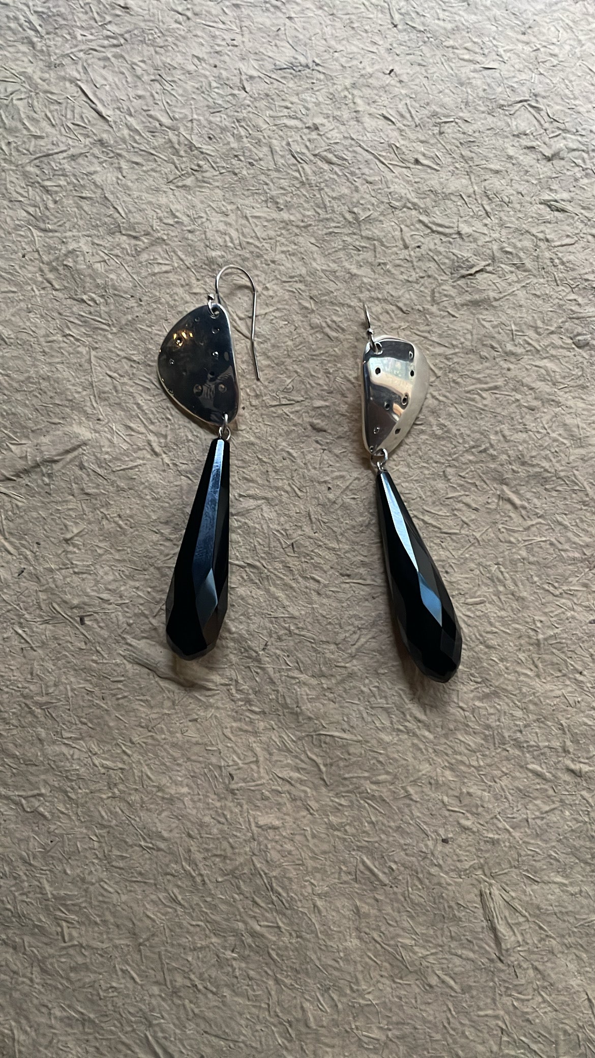 Material description: Sterling Silver, Grey Diamonds, Antique Facetted Black Agate Briolette Drop, White Gold