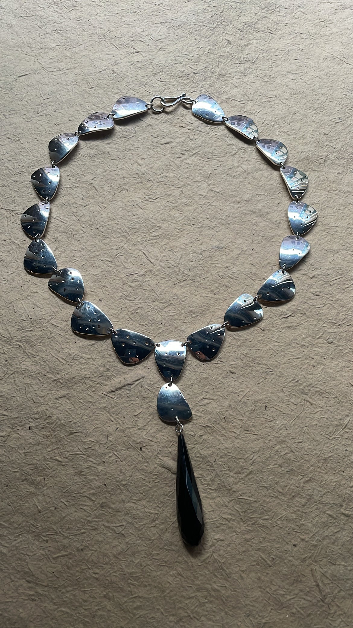 Begun in 2012 and completed thirteen years later, The Mermaid Suite stands as a meditation on devotion, patience, and transformation. Comprising a necklace, ear-pendants, and a ring, each element was formed by hand, every link carefully sawn from thick silver sheet, shaped on a sand wheel, dapped to a convex form, drilled, burnished, and polished to a silken gleam.