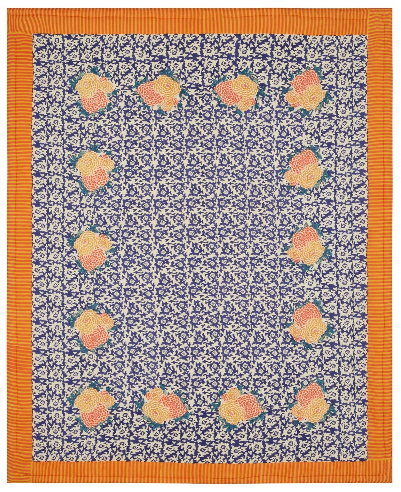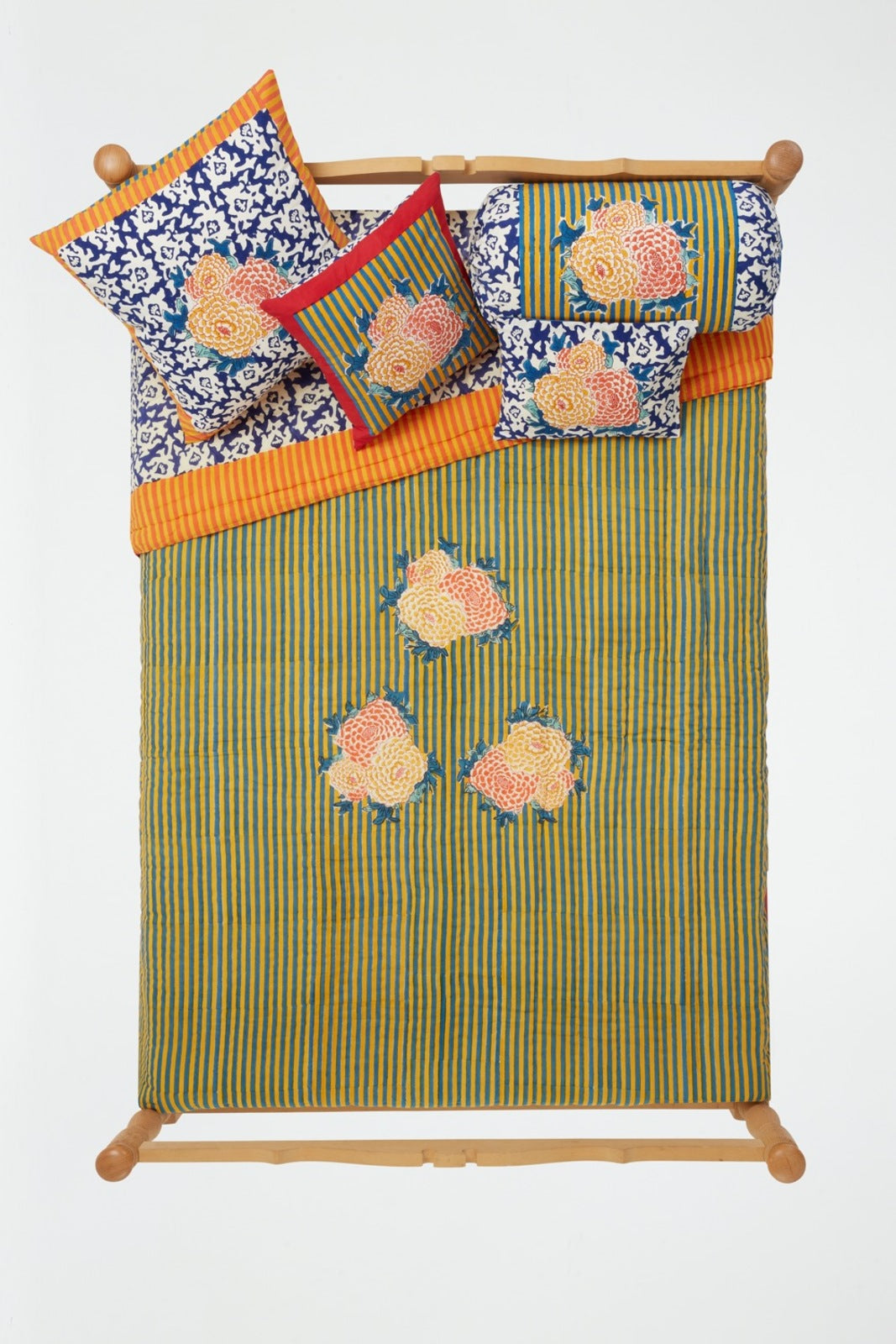 Arabesque Corolla Blue-Natural, Block Printed: This iconic Lisa Corti design merges Arabesque, inspired by an Indian miniature, with Corolla, a dahlia bouquet from a liberty tile. Sea-inspired hues in deep blue and coral, hand block printed, bring this archival masterpiece to life Light and incredibly soft, the beautiful block printed cotton muslin and 100% natural kapoc cotton filling of this unique quilt are meticulously hand-stitched to a personal design by skilled Indian artisans.