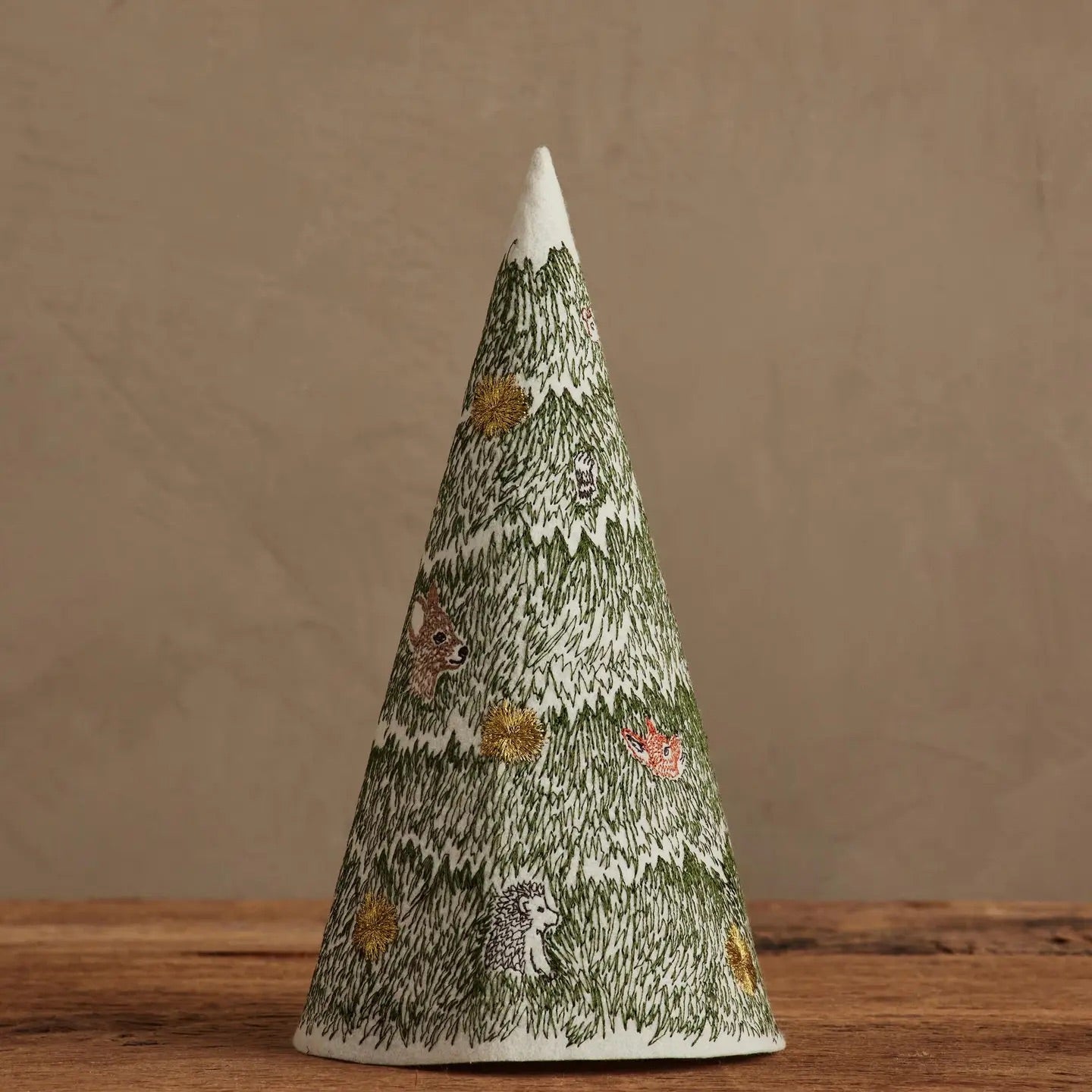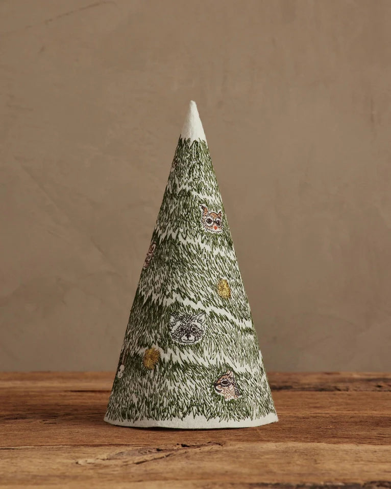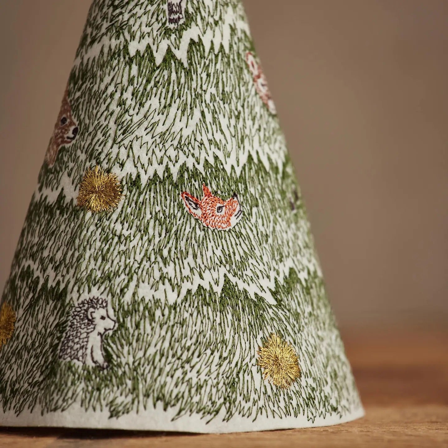 From the top of the Christmas tree and on each of the branches, all the way to the bottom of the trunk are woodland creatures brimming with excitement on Christmas morning! Spot deer, hedgehog, fox, bear, chipmunks, bunny, owl, raccoon and squirrel hiding in the tree adorned with gold metallic ornaments. Our felt trees are a unique table top decoration for the holiday season and can be paired with our Ring Around Christmas felt tree.