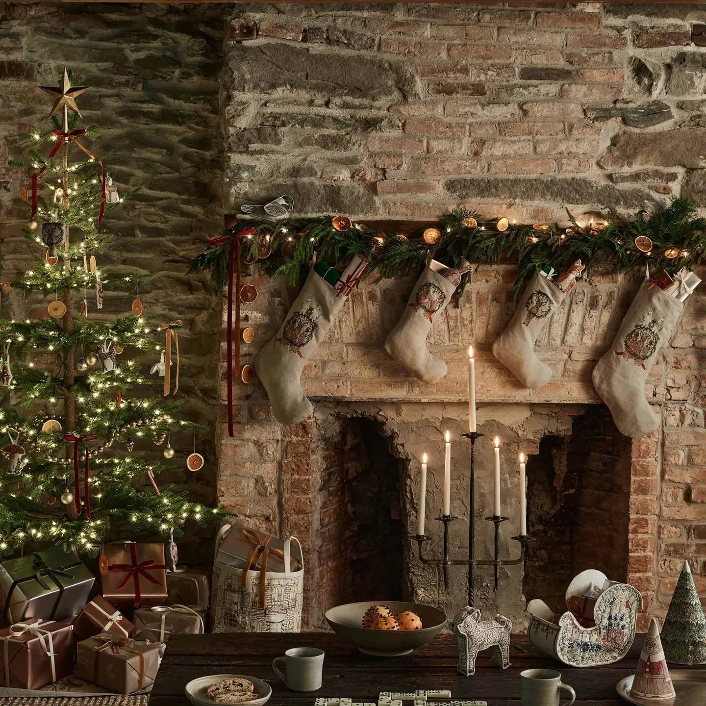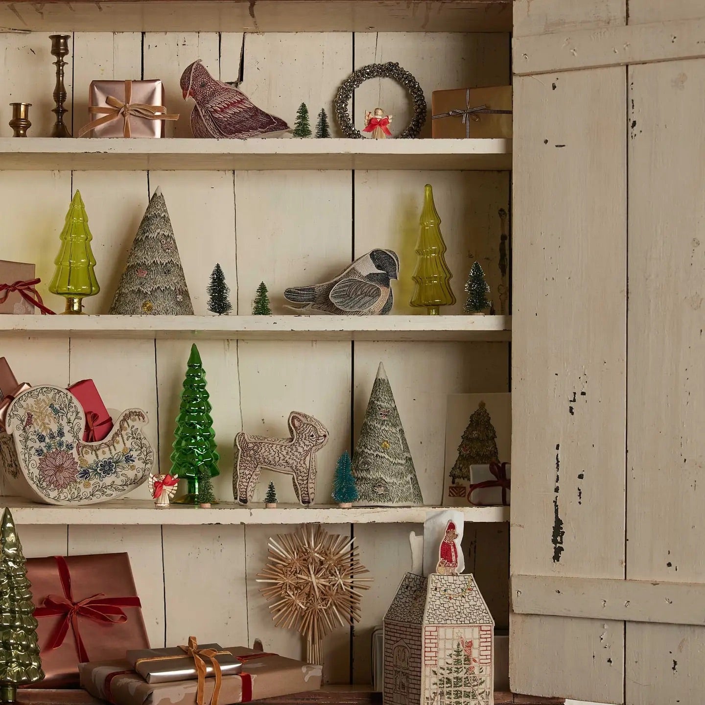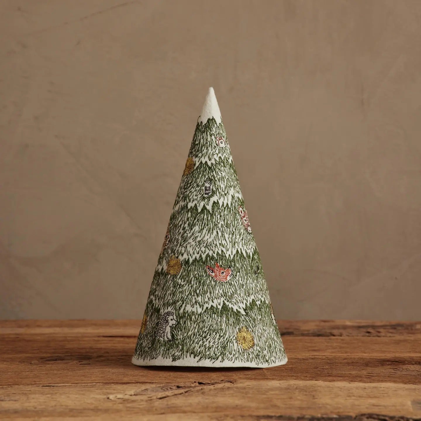 From the top of the Christmas tree and on each of the branches, all the way to the bottom of the trunk are woodland creatures brimming with excitement on Christmas morning! Spot deer, hedgehog, fox, bear, chipmunks, bunny, owl, raccoon and squirrel hiding in the tree adorned with gold metallic ornaments. Our felt trees are a unique table top decoration for the holiday season and can be paired with our Ring Around Christmas felt tree.