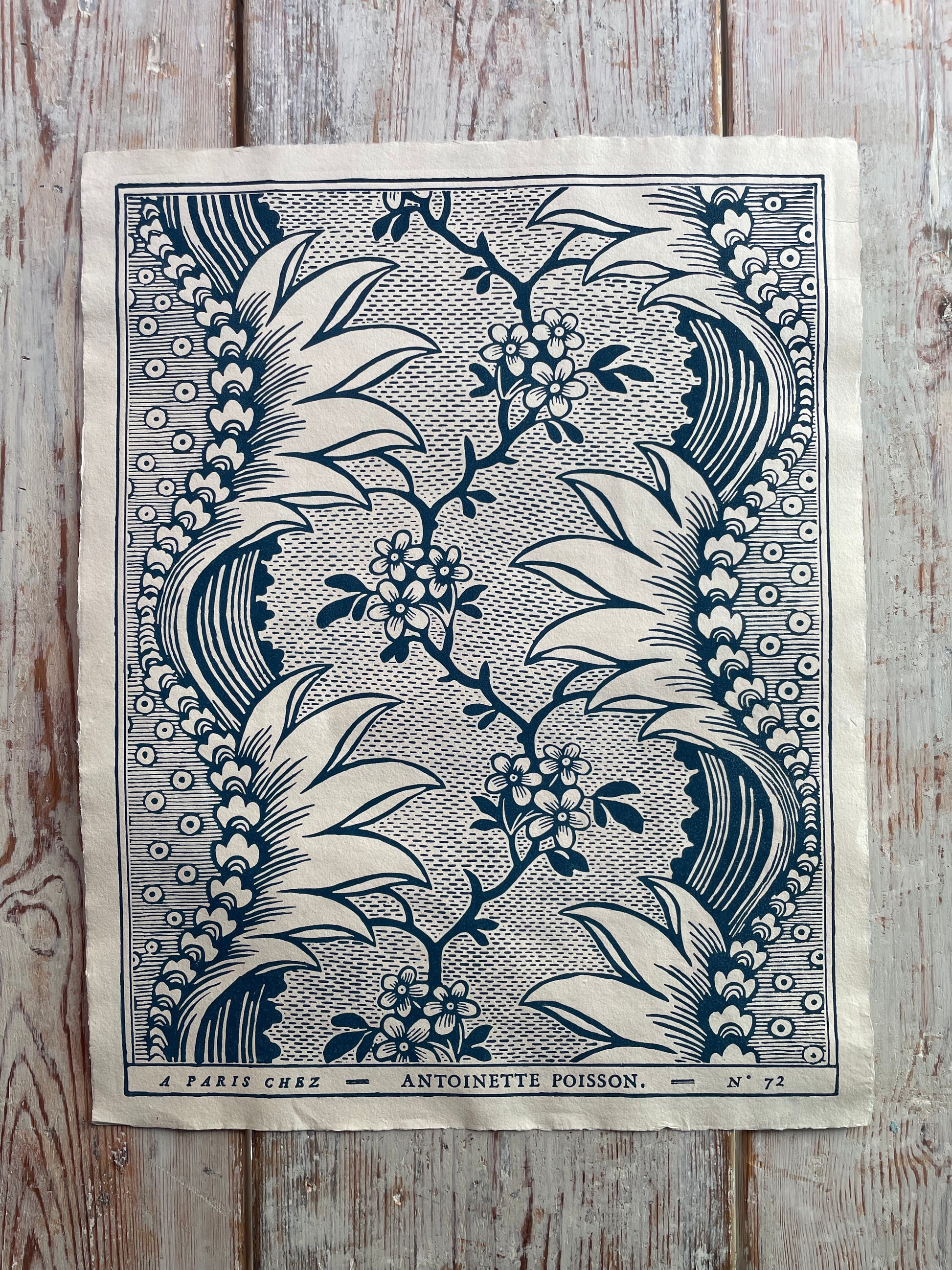 Printed in a single indigo tone, the sheet is produced using engraved plates and finished with hand-stenciled accents on laid, 100% rag paper — a faithful revival of traditional French techniques.