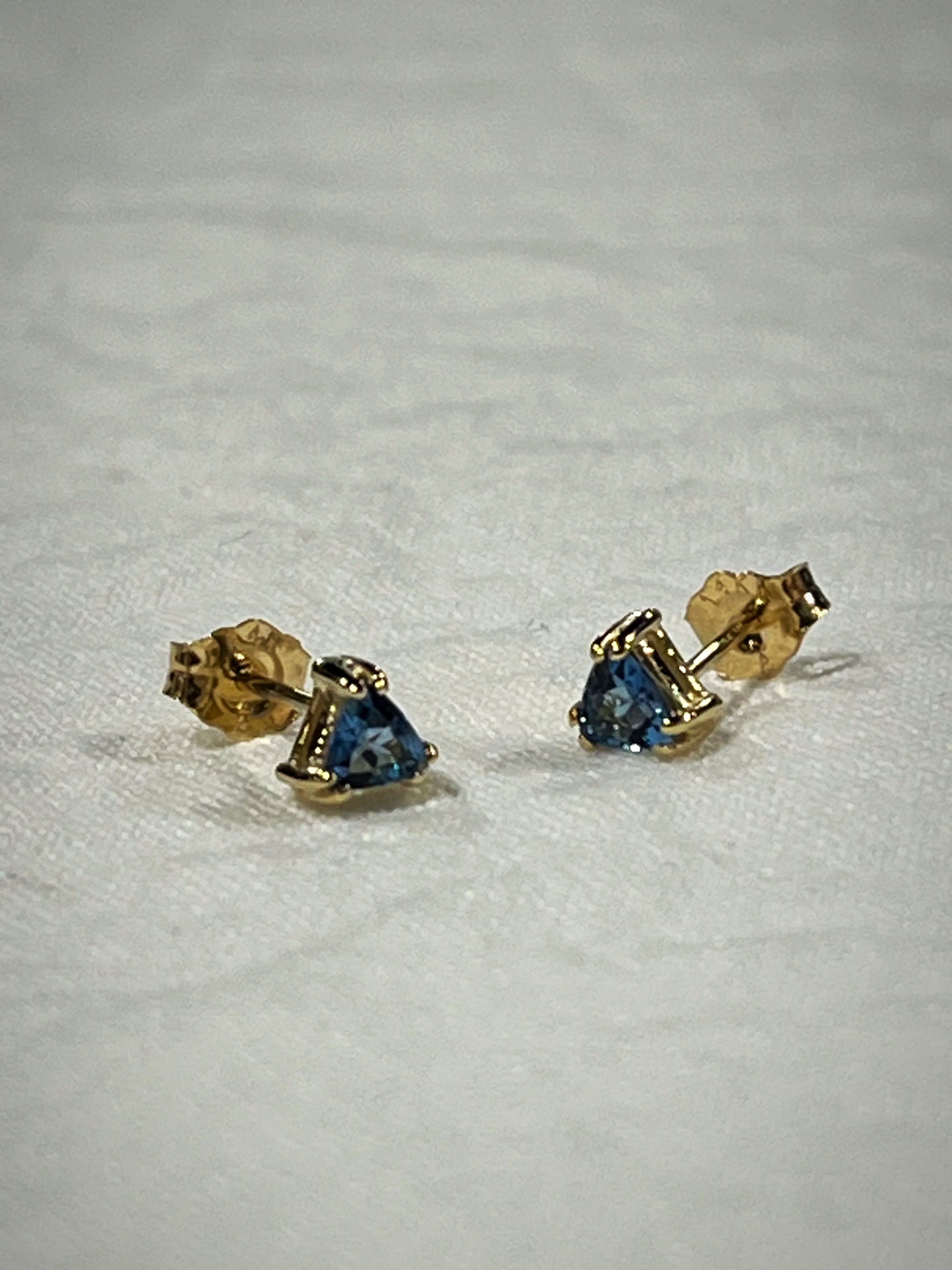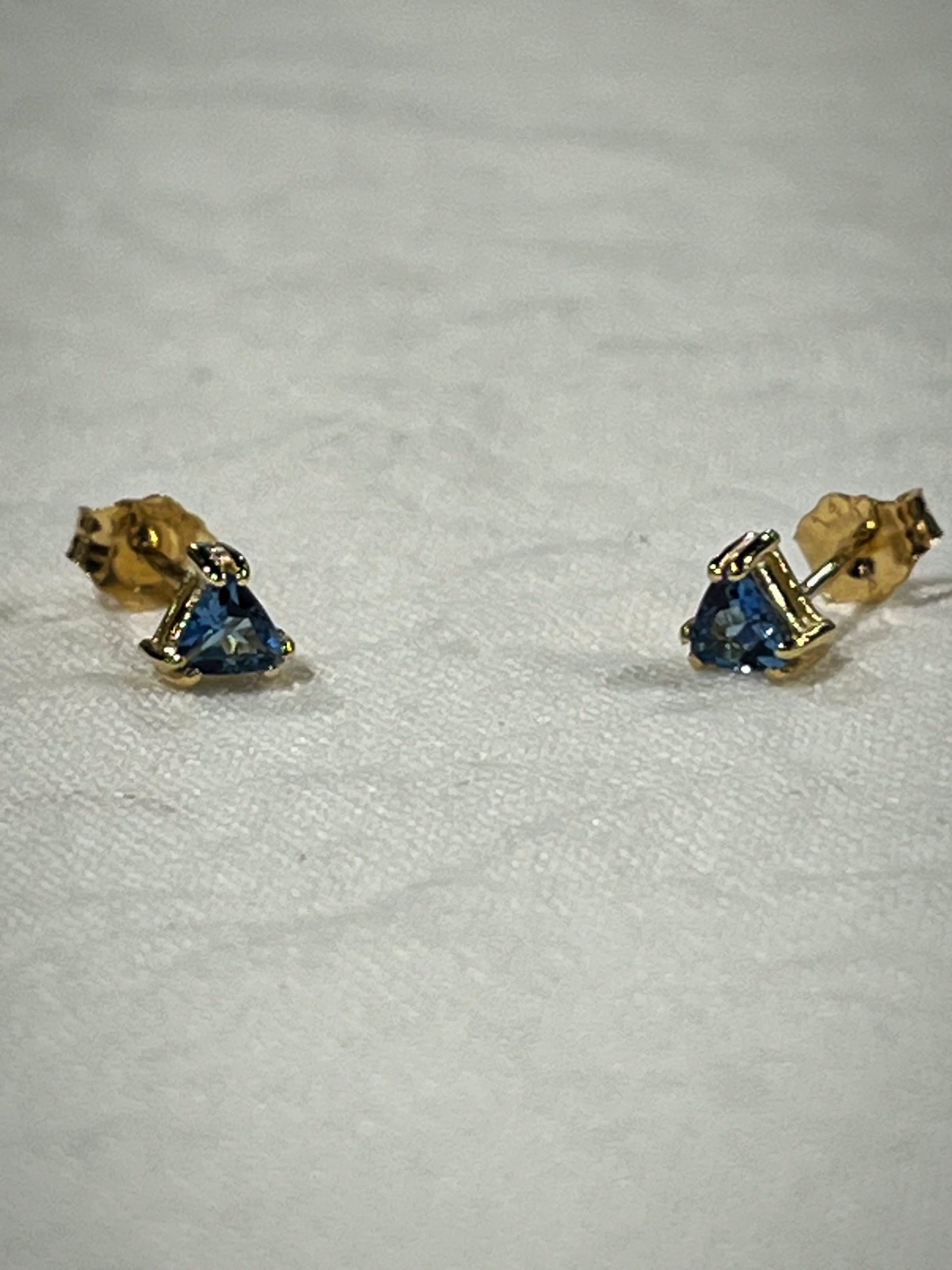 Trillion cut Sky Blue Aquamarine, Color: Baby Blue, app. 0.34 ct., measuring 3.5 mm, all set i open 6-prong setting, attached post and back. All fashioned in 14k Yellow gold (585).