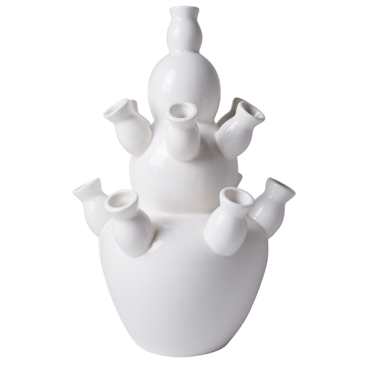 A white tulip vase composed of three rounded layers. This snow white tulip vase is one of our most iconic tulip vases. The tulip vase consists of three tiers that all have a round shape. This is also called a triple gourd vase. Around the convex bellies of the vase, there are several spouts scattered that protrude slightly upward. At the very top, one spout sticks straight up as the centerpiece.