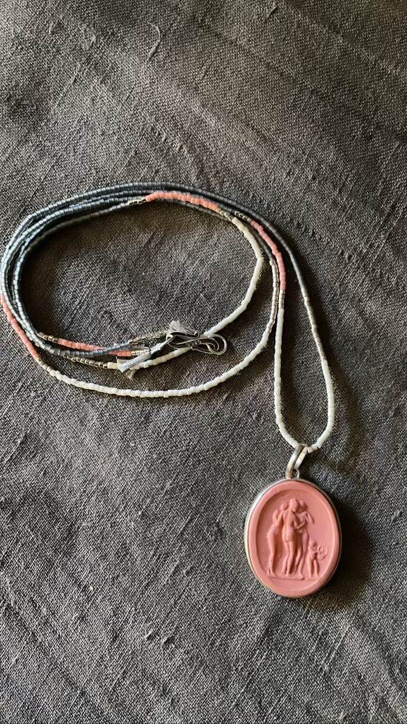 Some pendants are elegantly strung on hand-dyed silk or beaded cords, while others are set in silver for a more refined finish. Inspired by the classical motifs of European history, these pendants blend old-world charm with modern wearability.