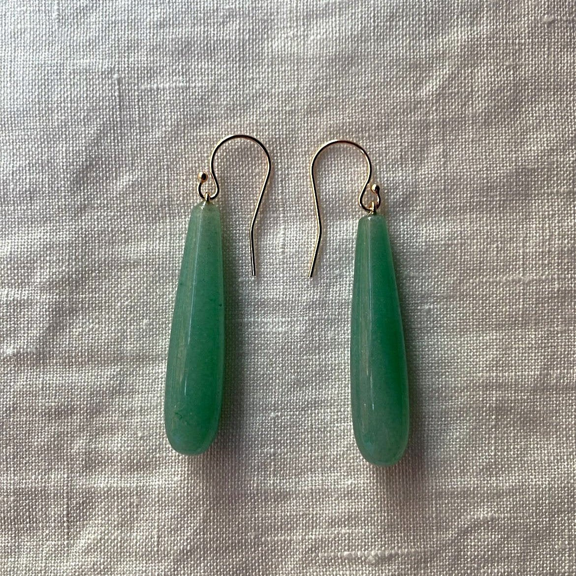 Aventurine and gold earrings, deep forest green, cabochon drop, set with yellow gold tops and attached 14k french ear-wires, contemporary, unique hand-cut gemstones.