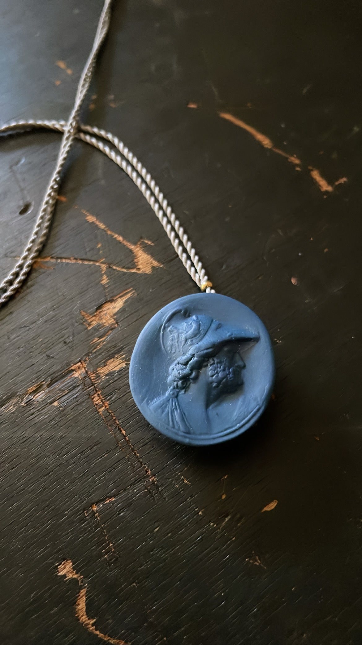 Some pendants are elegantly strung on hand-dyed silk or beaded cords, while others are set in silver for a more refined finish. Inspired by the classical motifs of European history, these pendants blend old-world charm with modern wearability.
