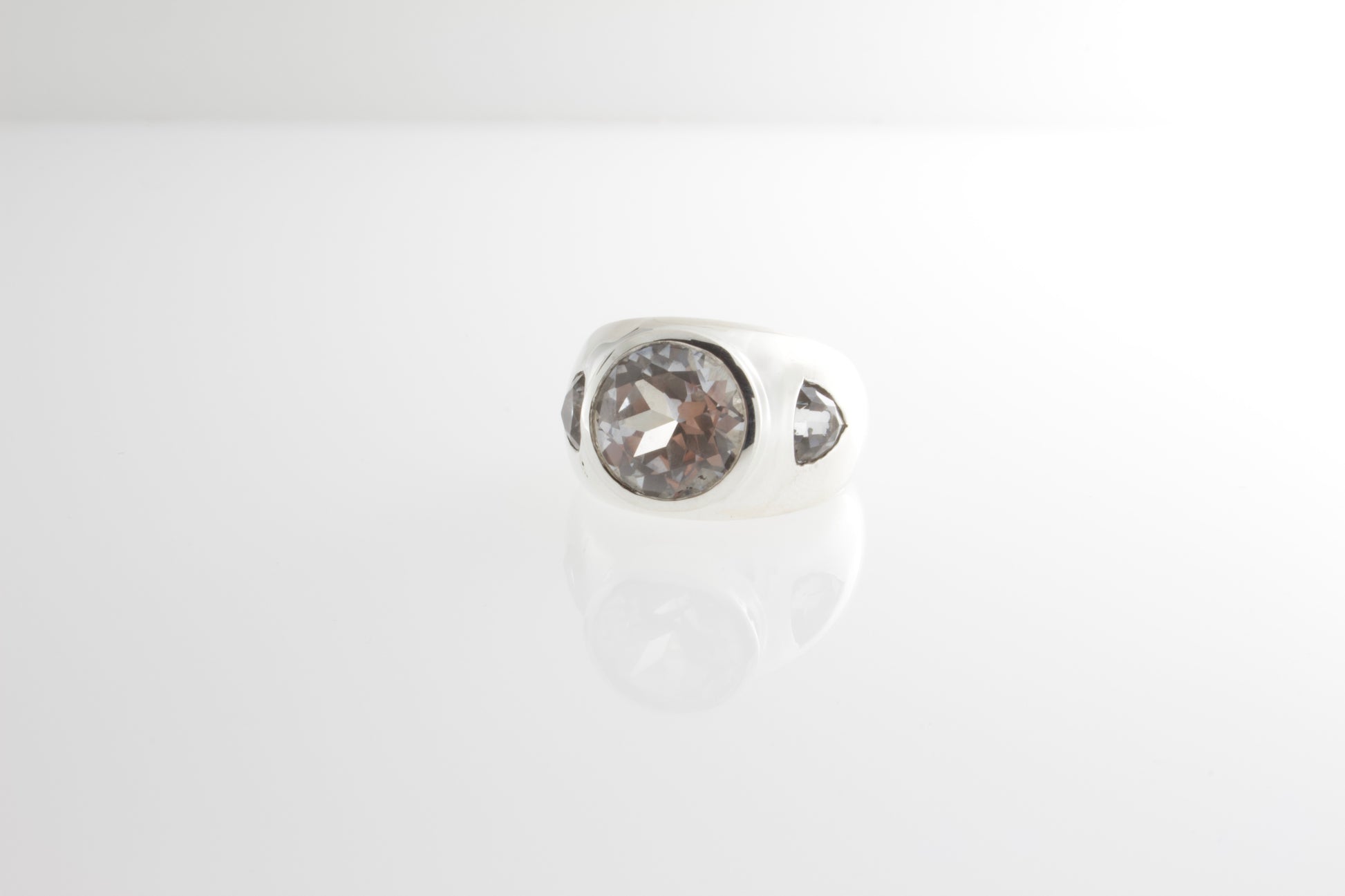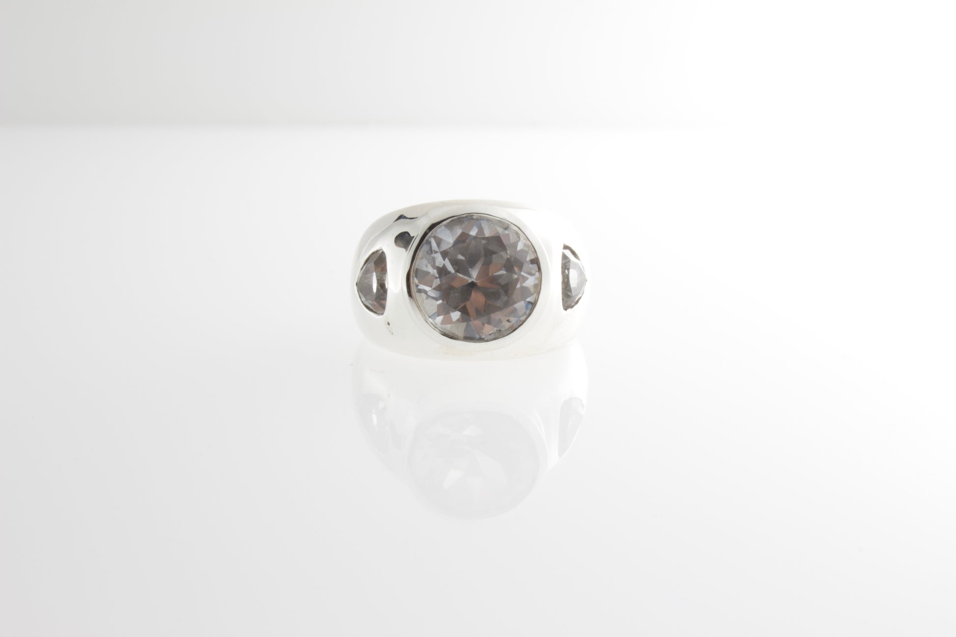 This cocktail ring is centering a clear Rock Crystal, brilliant cut, measuring 10mm, weighing approximately 4 carat, set in a bezel frame with a mirror cut, adorned by two trillion cut White Topaz (colorless) both burnished, fashioned in sterling silver.