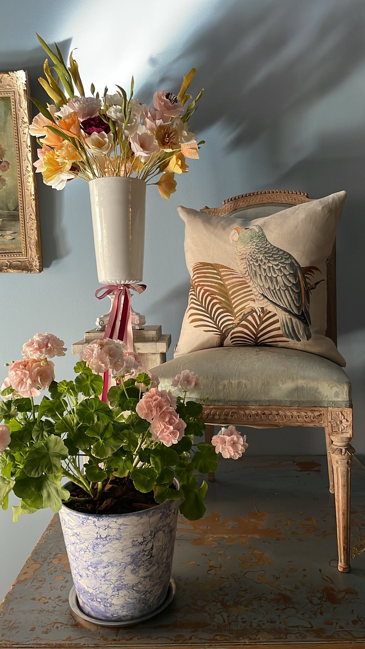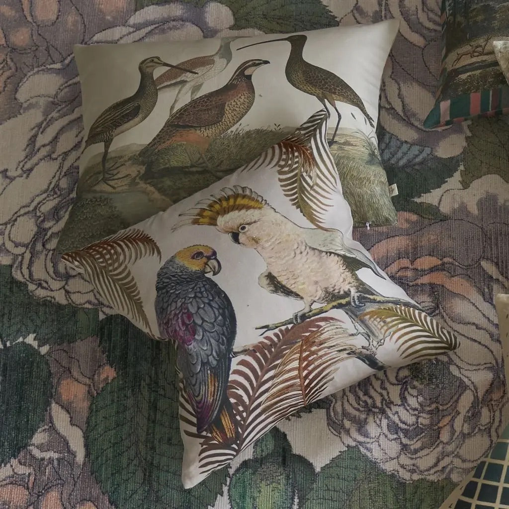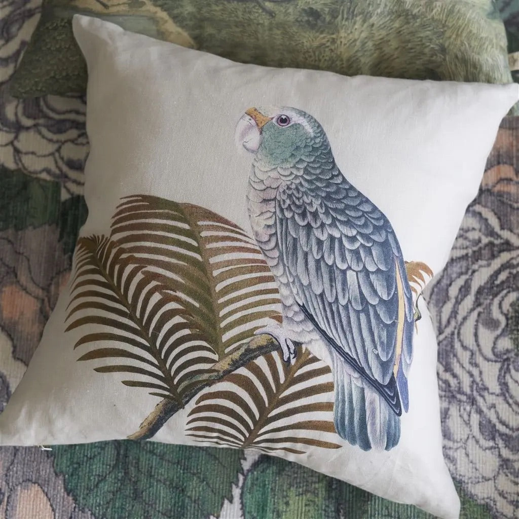 Surrounded by exotic palms, elegant parrots are the centre of attention in this large statement cushion by John Derian. Digitally printed onto pure linen with embroidered highlights and a sophisticated parrot features on the reverse. This decorative cushion is complemented by our best-selling Brera Lino plain linen cushions.