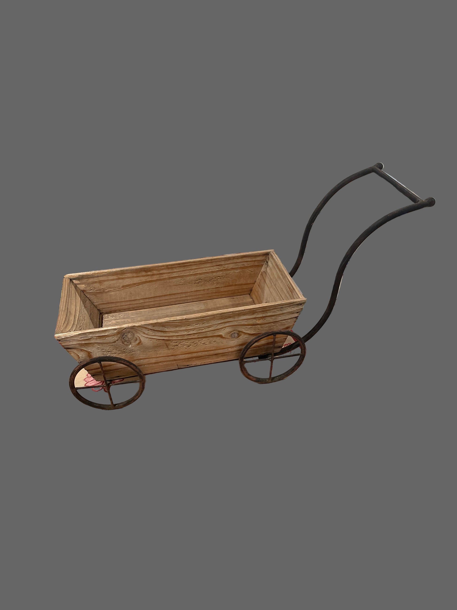 A rustic wooden wagon with iron wheels and curved handles. A charming display piece for ornaments, pinecones, or tiny wrapped gifts on a table or windowsill.