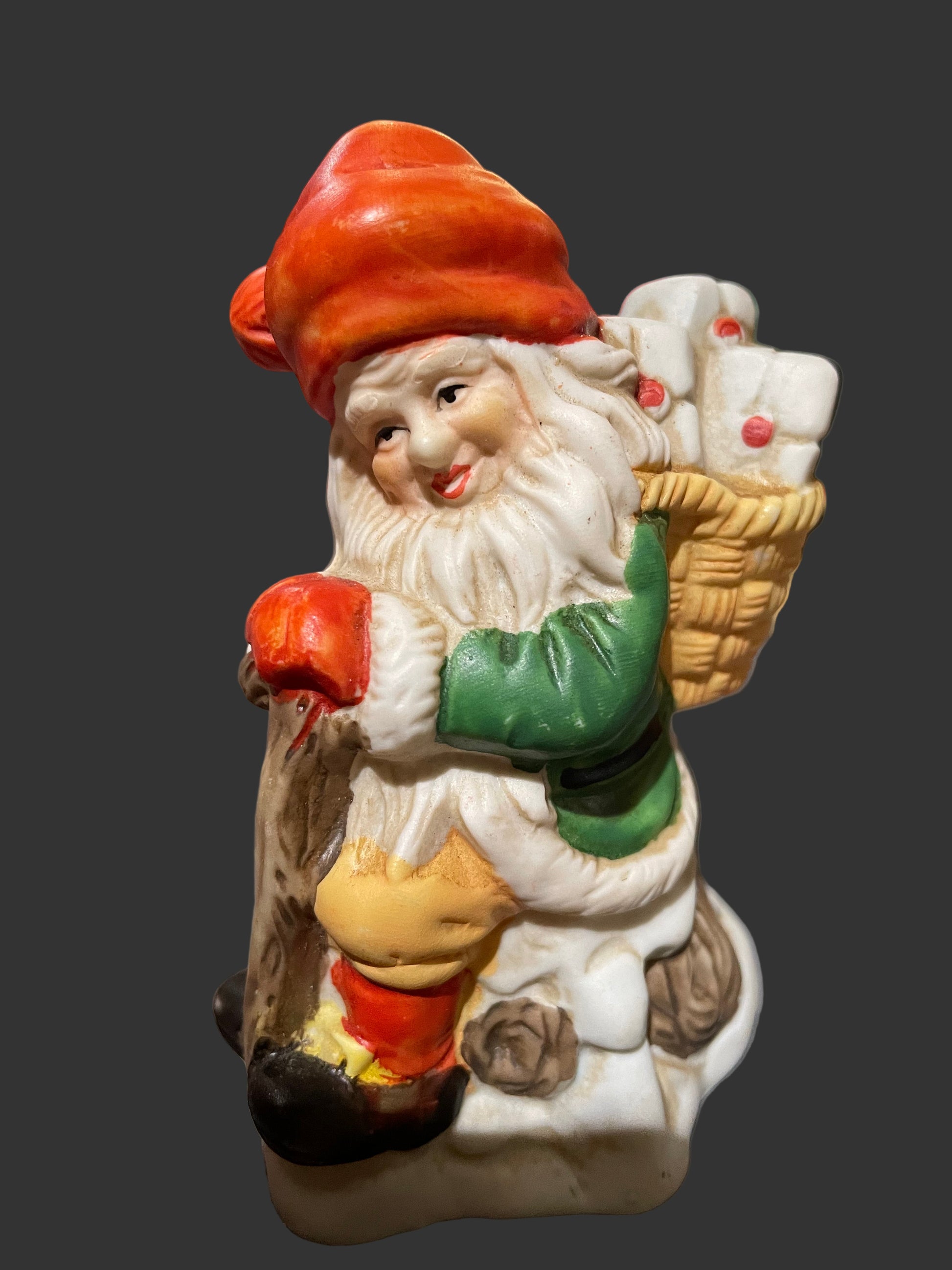 A cheerful Scandinavian nisse with an orange cap, green coat, and snowy boots, carrying a basket full of wrapped parcels and a walking stick for the winter path. Hand-painted ceramic with sweet folk-art details and a soft vintage patina. Lovely on a mantel, bookshelf, or tucked into a holiday village. Vintage condition with gentle wear consistent with age.