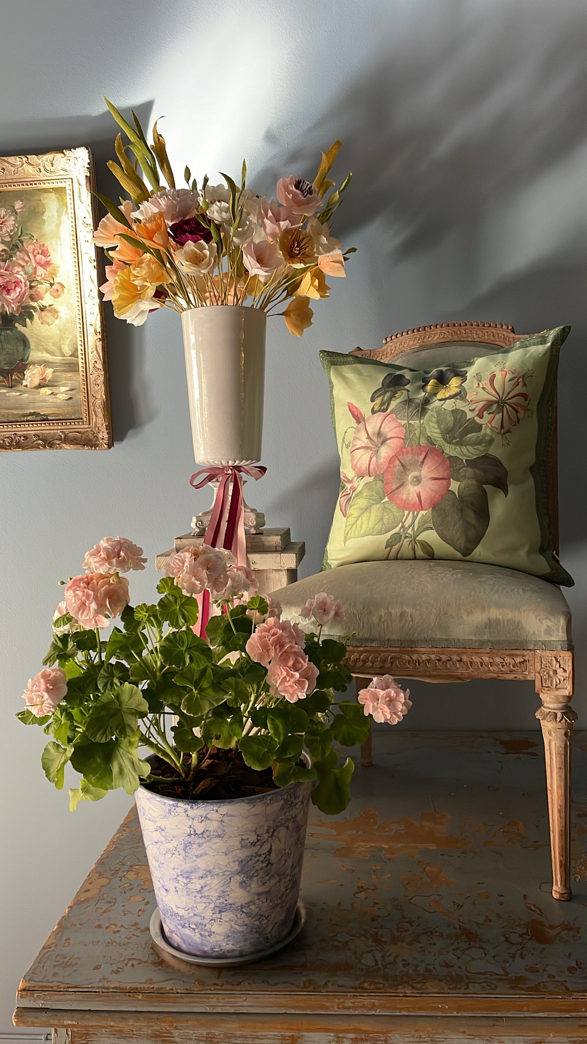 Graphic linear, botanical drawings of flowers and leaves are overlaid with delicately tinted blooms and set on a sage green ground in this wondrous square floral cushion by John Derian. Digitally printed onto a textured cotton and finished with a tiled border detail.