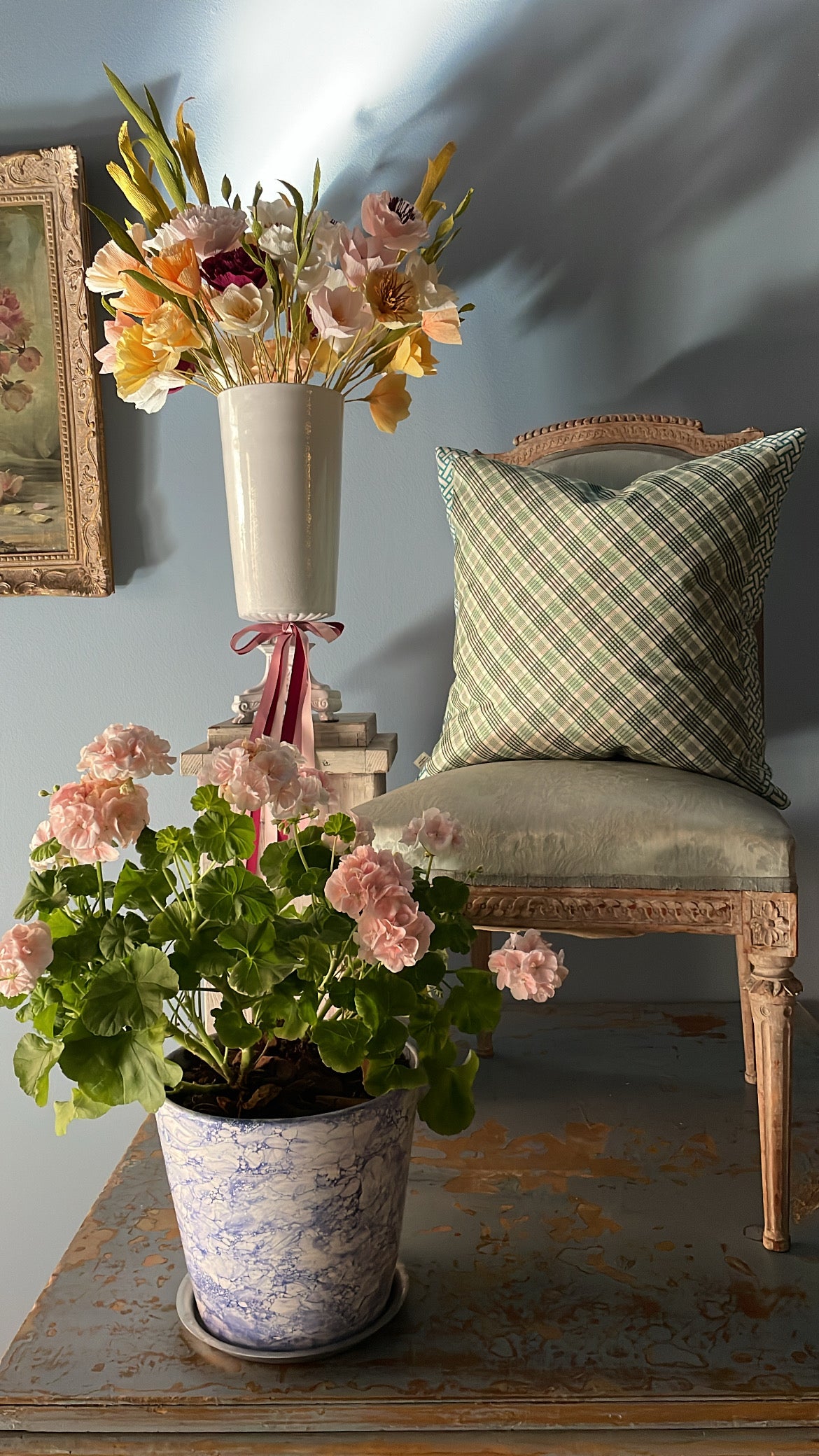 A botanical illustration of crown lilies in glorious hues. Framed by a contrasting geometric pattern, this serene floral cushion by John Derian is digitally printed onto a linen/cotton blend and paired with an argyle pattern printed onto pure cotton on the reverse.