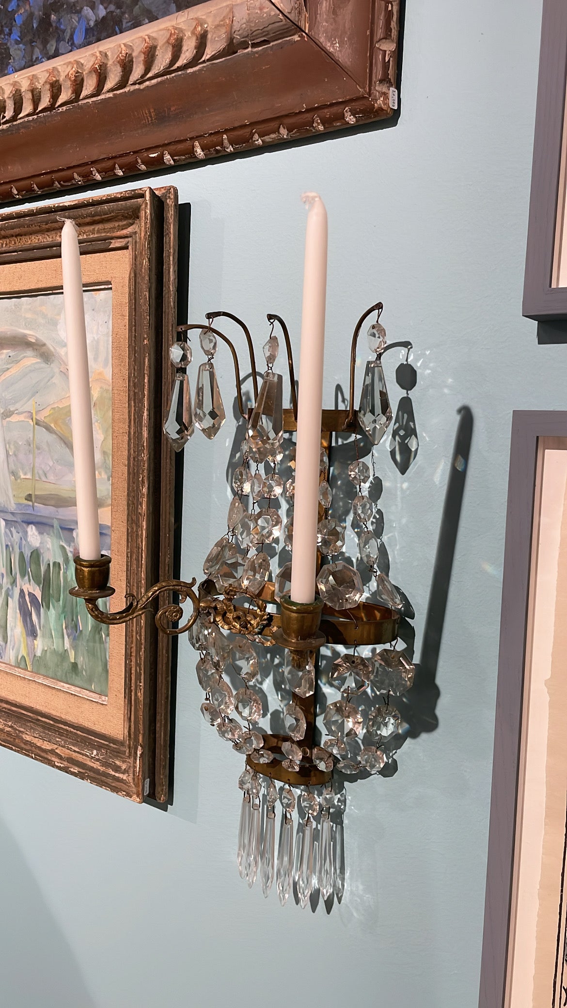 Handcrafted in solid brass, these sconces radiate quiet opulence. The gilt surfaces carry a soft patina, revealing decades of history, while the delicate crystal drops catch and scatter light in subtle, romantic reflections.