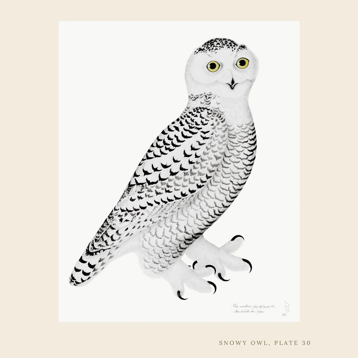 Lithograph of Snowy Owl, plate no. 30 from the "The Great Bird Book" by Olof Rudbeck The Younger.