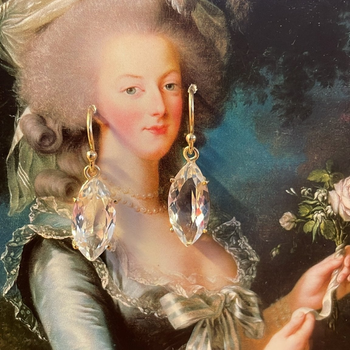These elegant earrings feature clear white topaz gemstones cut into a refined marquise silhouette. The faceted stones capture and reflect light with a delicate brilliance, while the four-prong gold baskets allow the clarity of the gemstones to remain fully visible.