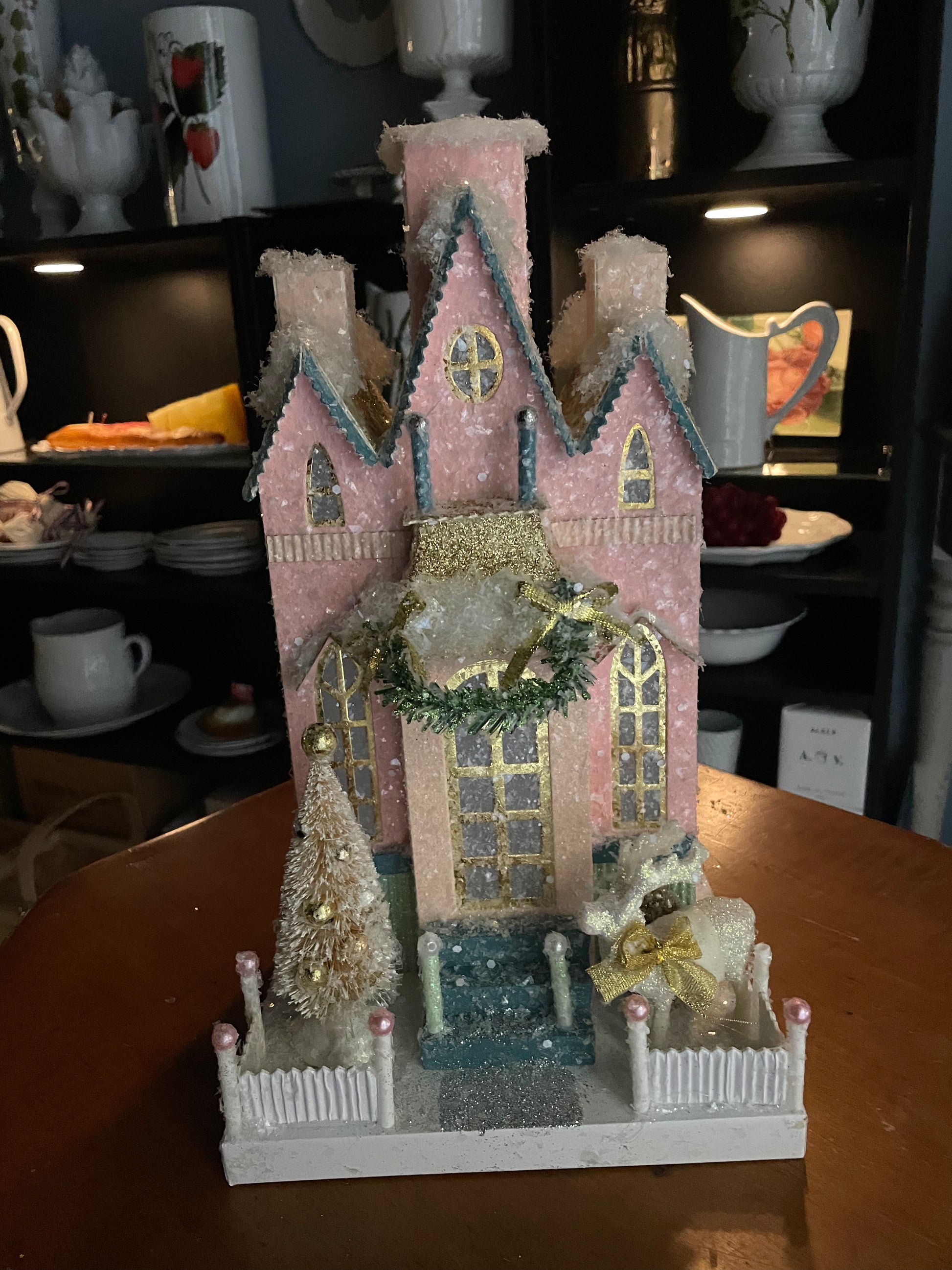 Perfect for mantles, holiday tables, or tucked into a magical Christmas village display, this piece radiates timeless charm and Yuletide delight. Crafted from sturdy cardboard and finished with frosty sparkle, it brings the Christmases of yesteryear into your home.