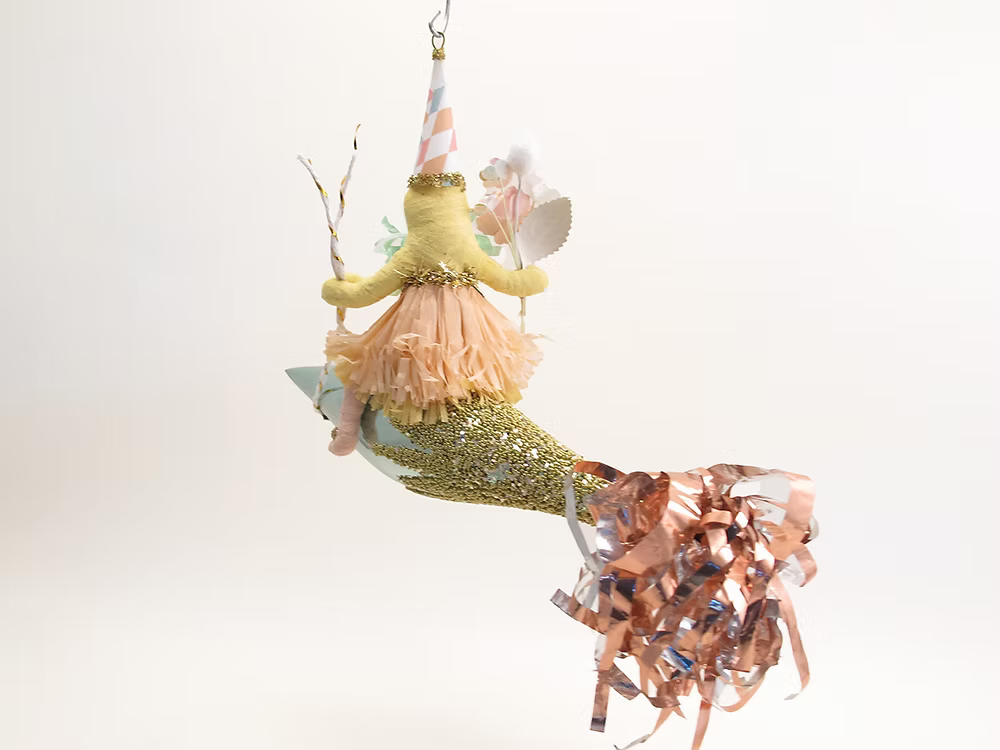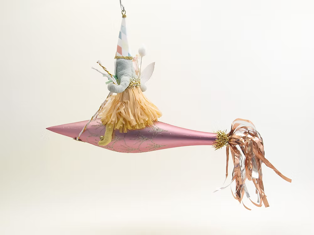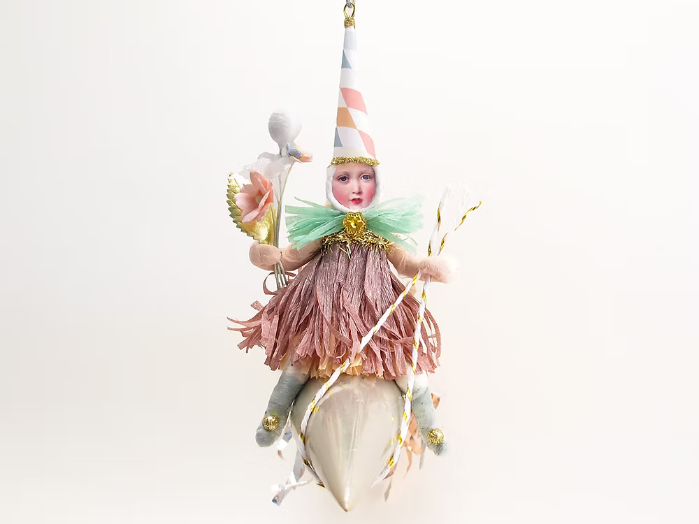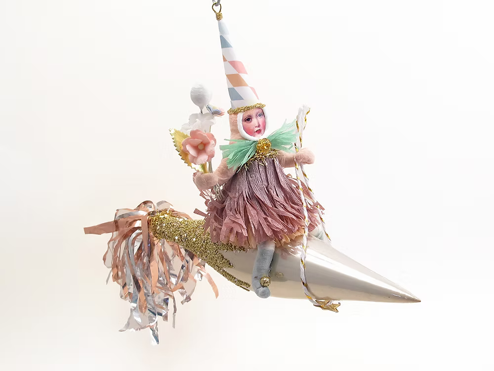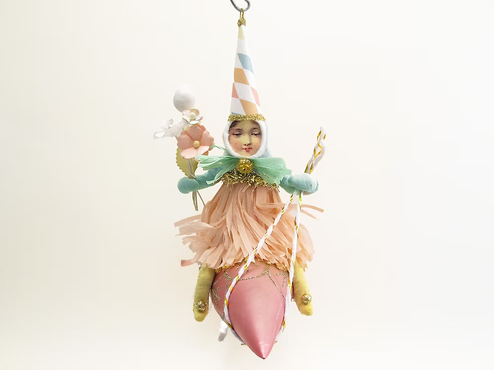 Spun cotton whimsy from upstate New York. Handmade by Crystal and Ben Sloane, each figure revives a rare 19th-century German technique and is finished with hand-painted detail and vintage-style trims. Light, nostalgic, and heirloom quality, these whimsical Santas, angels, animals and snowmen add timeless magic to the tree. Each piece is handmade, so slight variations are part of the charm.