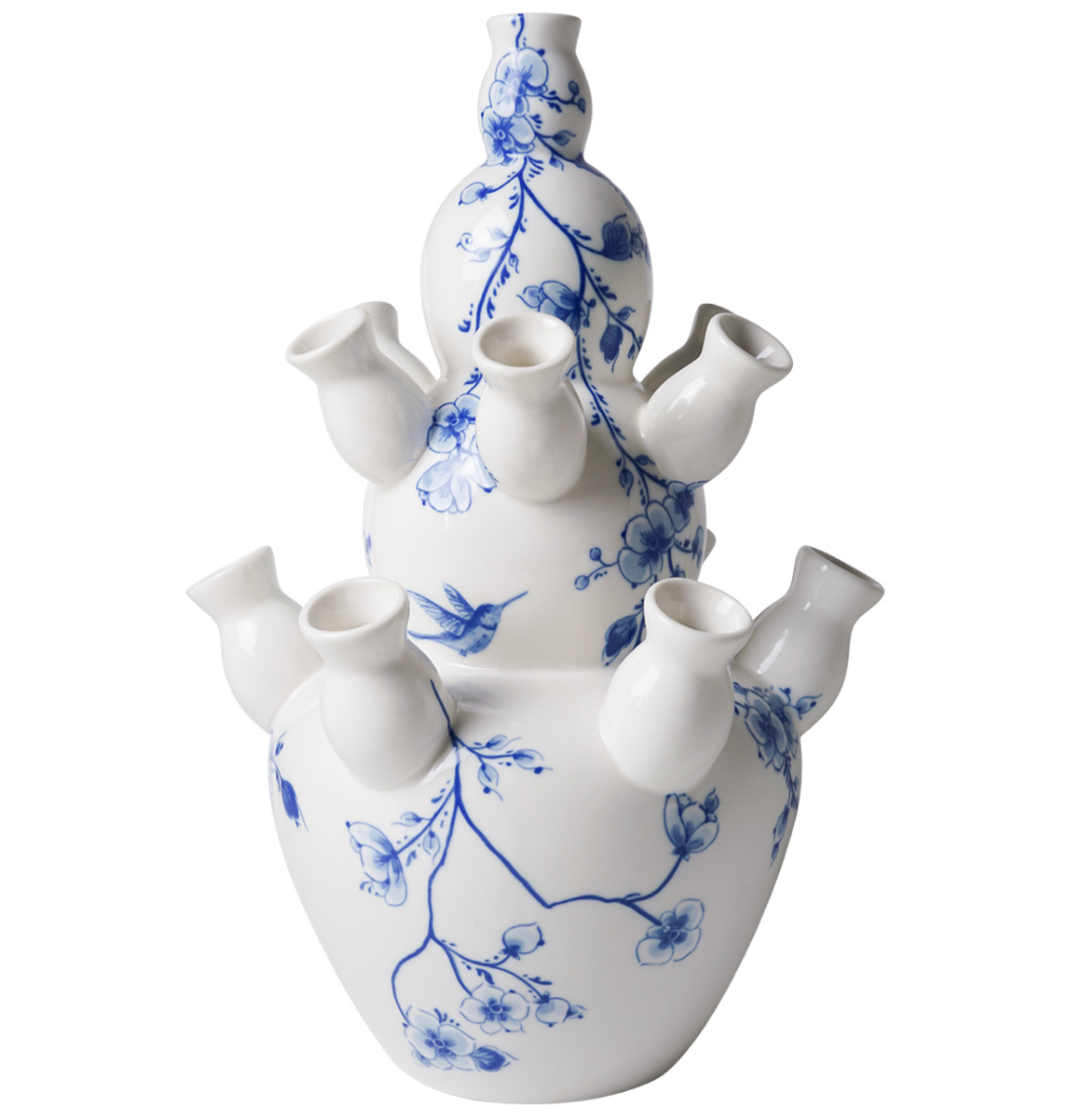 A white tulip vase composed of three rounded layers. One of our most iconic tulip vases, this snow-white tulip vase is decorated all around with slender, Delft blue orchid flowers. The tulip vase consists of three tiers that all have a round shape. This is also called a triple gourd vase. Around the convex bellies of the vase, there are several spouts scattered that protrude slightly upward. At the very top, one spout sticks straight up as the centerpiece.