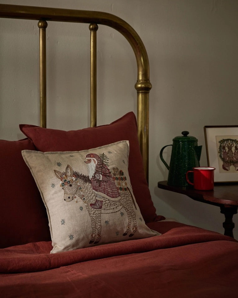 Make way for Santa's arrival as he rides on the Christmas Donkey! This season, Fox dresses up as Santa with a silver metallic beard, a crimson red cloak, and cozy boots. The Christmas Donkey is adorned in vibrant garlands and helps Santa carry a basket of toys and a Christmas tree. Embroidered with glimmering metallic threads and festive orange, marigold, and deep teal accents.