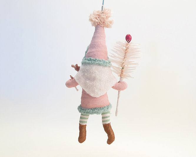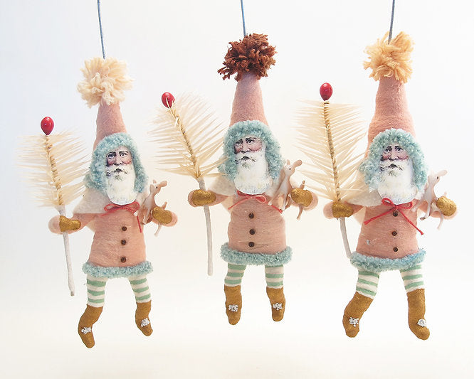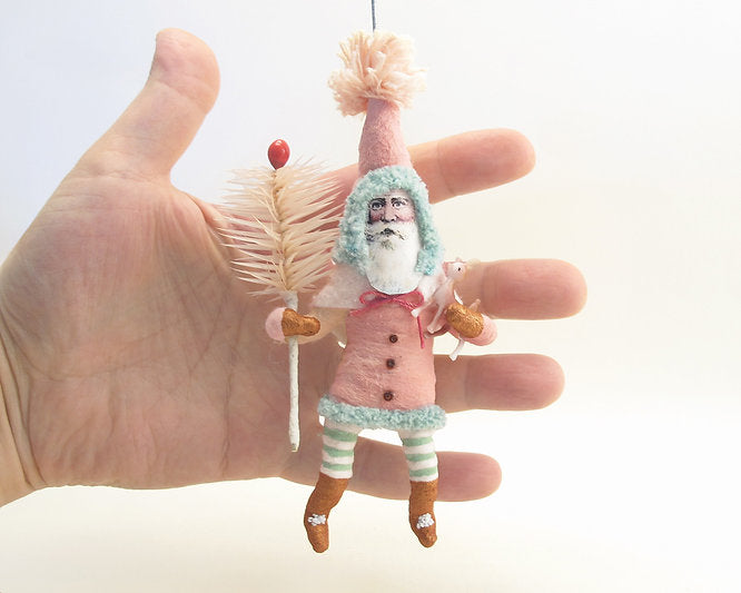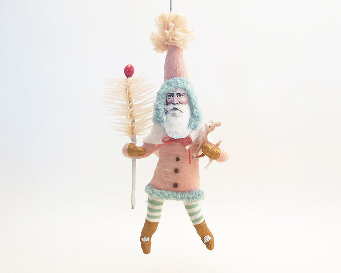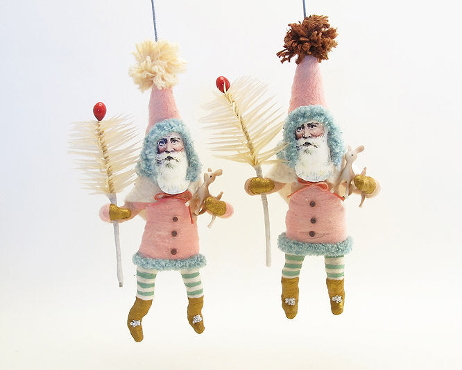 Pink Santa With Fawn & Goose Feather Sprig | Vintage by Crystal Spun Cotton Ornament