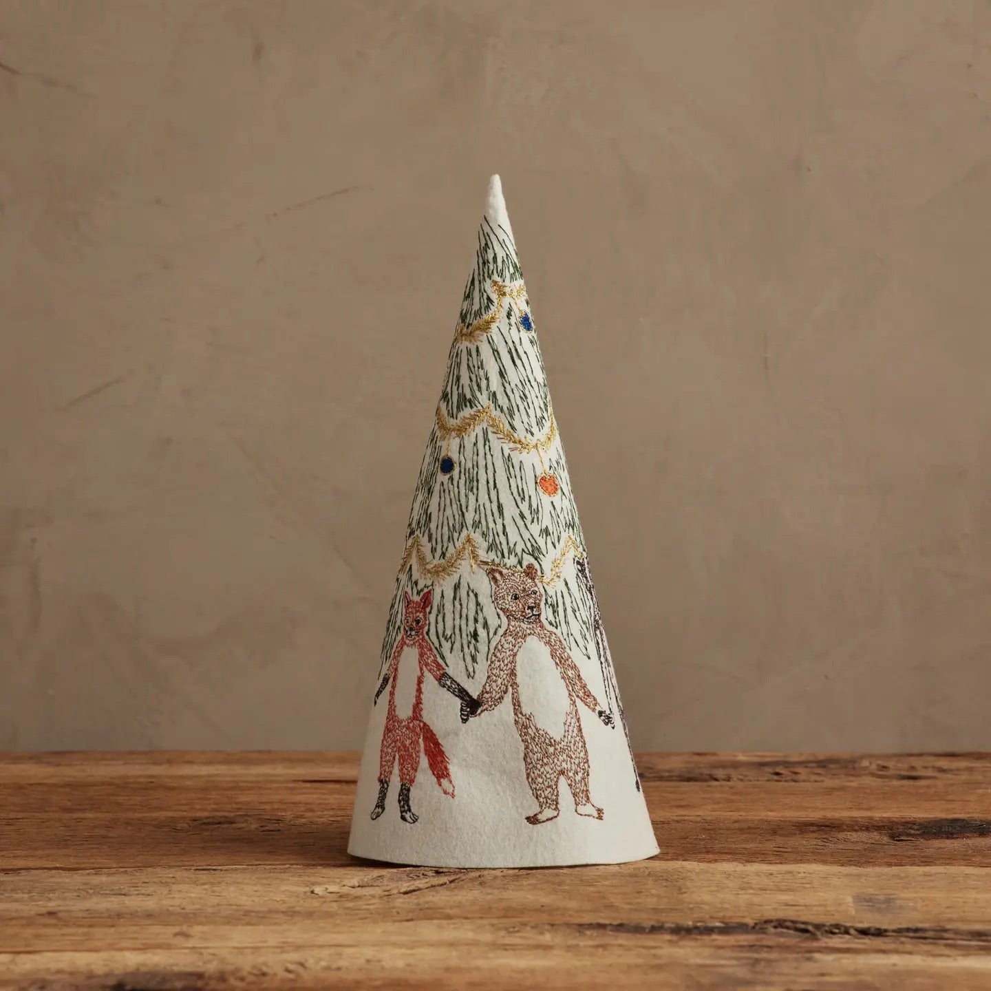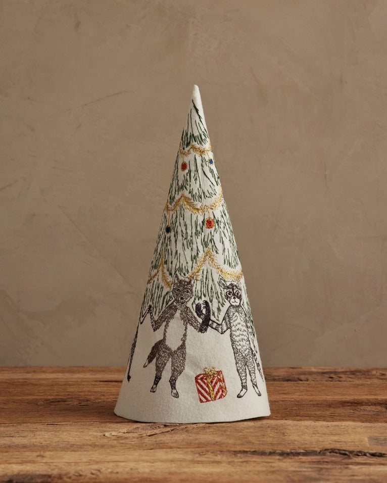 Fox, bear, badger, wolf and raccoon hold paws around the Christmas tree to celebrate the season! The Christmas tree is decorated with colorful ornaments and metallic gold tinsel. Our felt trees are a unique table top decoration for the holiday season and can be paired with our Peek-a-tree felt tree.