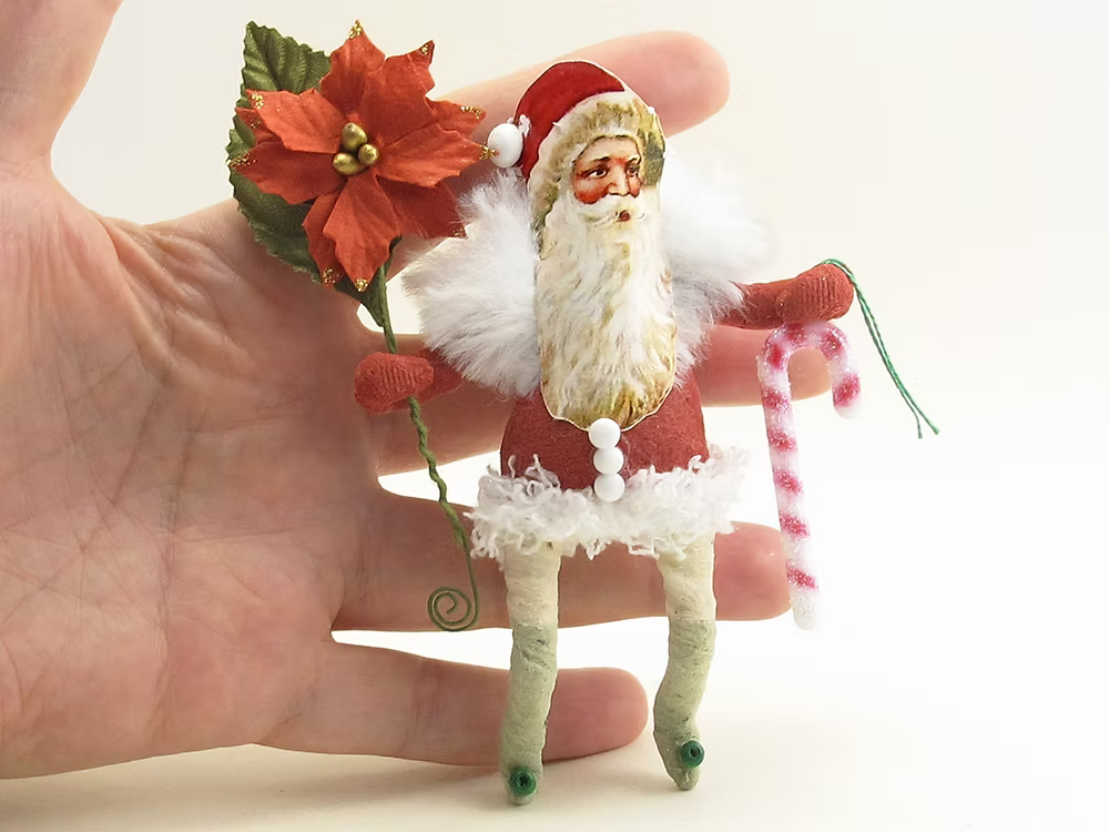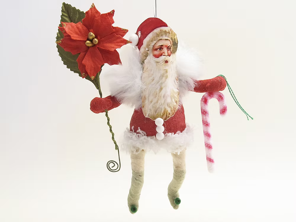 Santa With Flower And Candy Cane Ornament| Vintage by Crystal Spun Cotton Ornament | Vintage by Crystal Spun Cotton Ornament