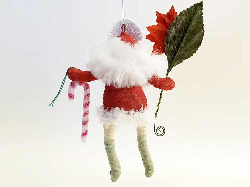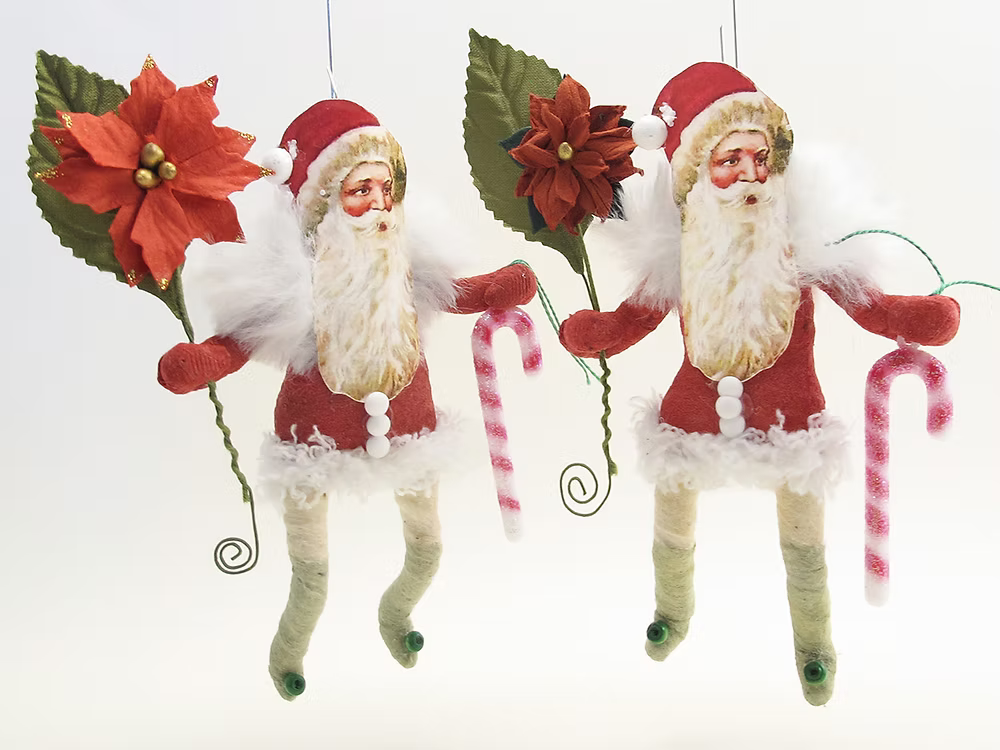 Spun cotton whimsy from upstate New York. Handmade by Crystal and Ben Sloane, each figure revives a rare 19th-century German technique and is finished with hand-painted detail and vintage-style trims. Light, nostalgic, and heirloom quality, these whimsical Santas, angels, animals and snowmen add timeless magic to the tree. Each piece is handmade, so slight variations are part of the charm.