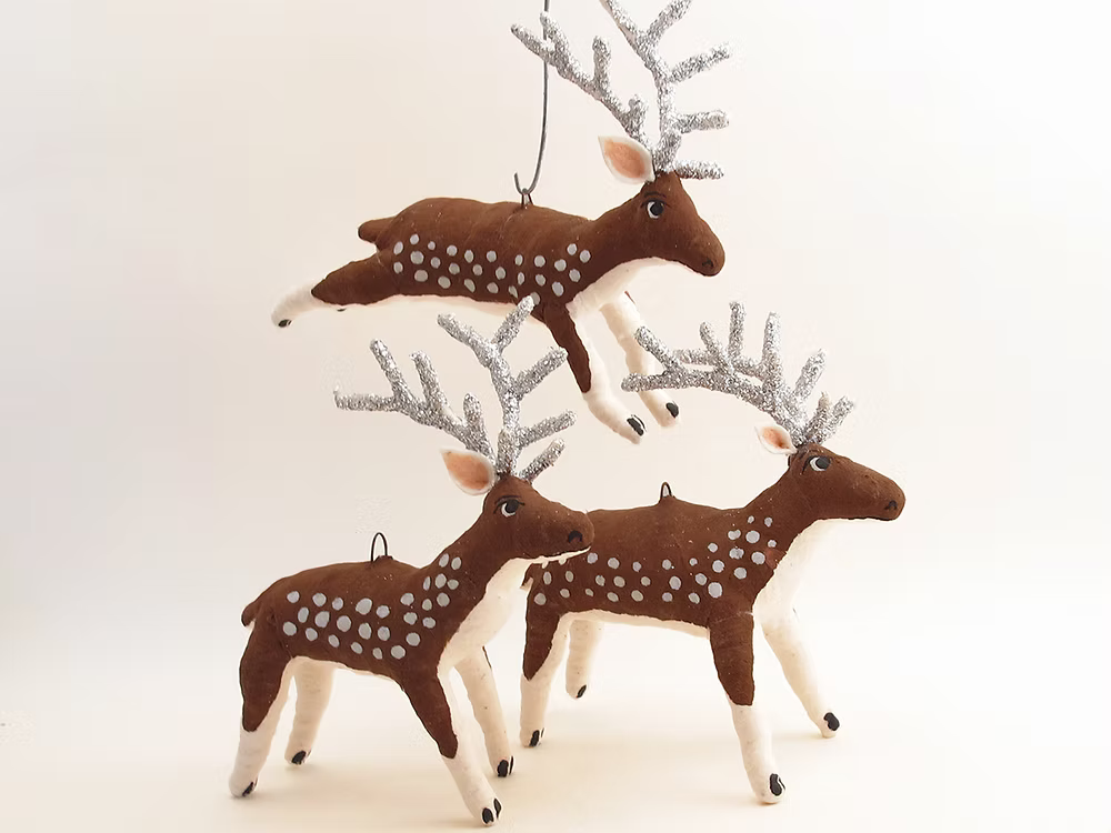 Spun cotton whimsy from upstate New York. Handmade by Crystal and Ben Sloane, each figure revives a rare 19th-century German technique and is finished with hand-painted detail and vintage-style trims. Light, nostalgic, and heirloom quality, these whimsical Santas, angels, animals and snowmen add timeless magic to the tree. Each piece is handmade, so slight variations are part of the charm.