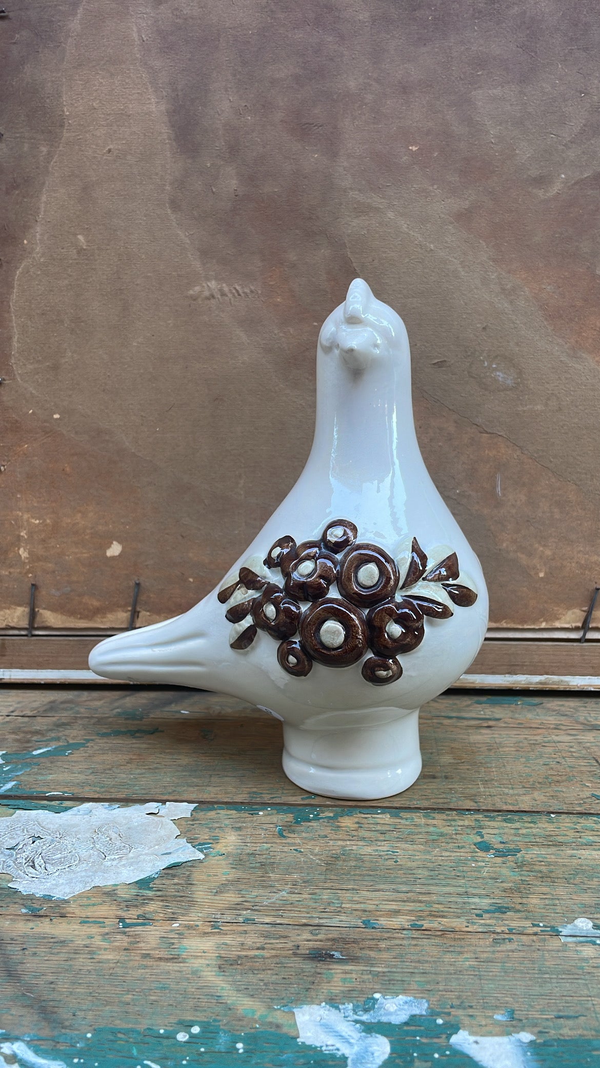 A sculptural vintage ceramic bird designed by Rosa Ljung, featuring a softly glazed white body accented with rich brown floral relief. The elongated form and gently raised detailing give the piece a calm but confident presence, balancing decorative charm with Scandinavian restraint.