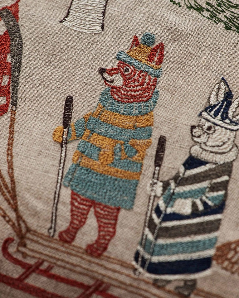 Woodland friends celebrate the solstice and embrace the wonders of the season in our Winter Fun design. Dressed in wool coats, colorful parkas, and knitted sweaters, these woodland animals sled and cross-country ski among aspen and evergreen trees. A Shih Tzu puppy leads the way, bounding through the snow, and bear, fox, rabbit, and owl follow behind. In the top corner, find a cat and fox on skis and a bunny peeking up from the ground.
